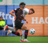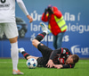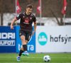 Fer í tæklingu á miðjum vellinum er ÍBV sækir. Kemur aftan að Bjarka Birni og teygir sig í hann.