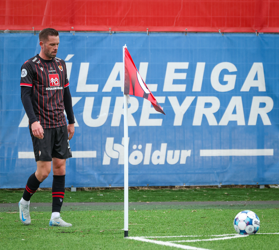 Sveinn Gísli með fyrirgjöf. Aron Elís fyrstur á boltann en skalli hans af varnarmanni og afturfyrir.