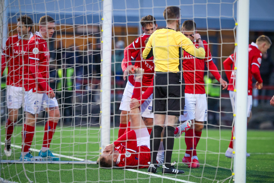 Orri Sigurður með krampa og leikurinn stopp. Þetta mun fara eitthvað yfir 96 mínúturnar.