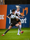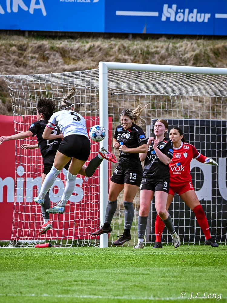 Hope Santaniello fær boltann í fínu færi innan teigs og lætur vaða en Arna Eiríks. gerir ótrúlega vel og rennur sér fyrir skotið og sóknin rennur út í sandinn.