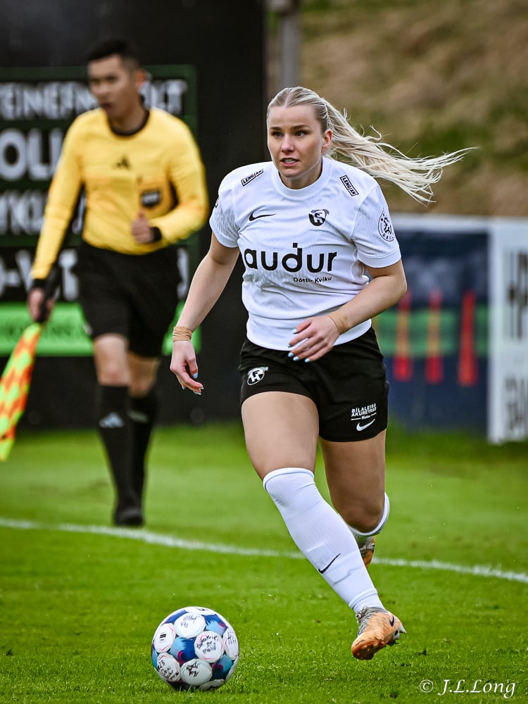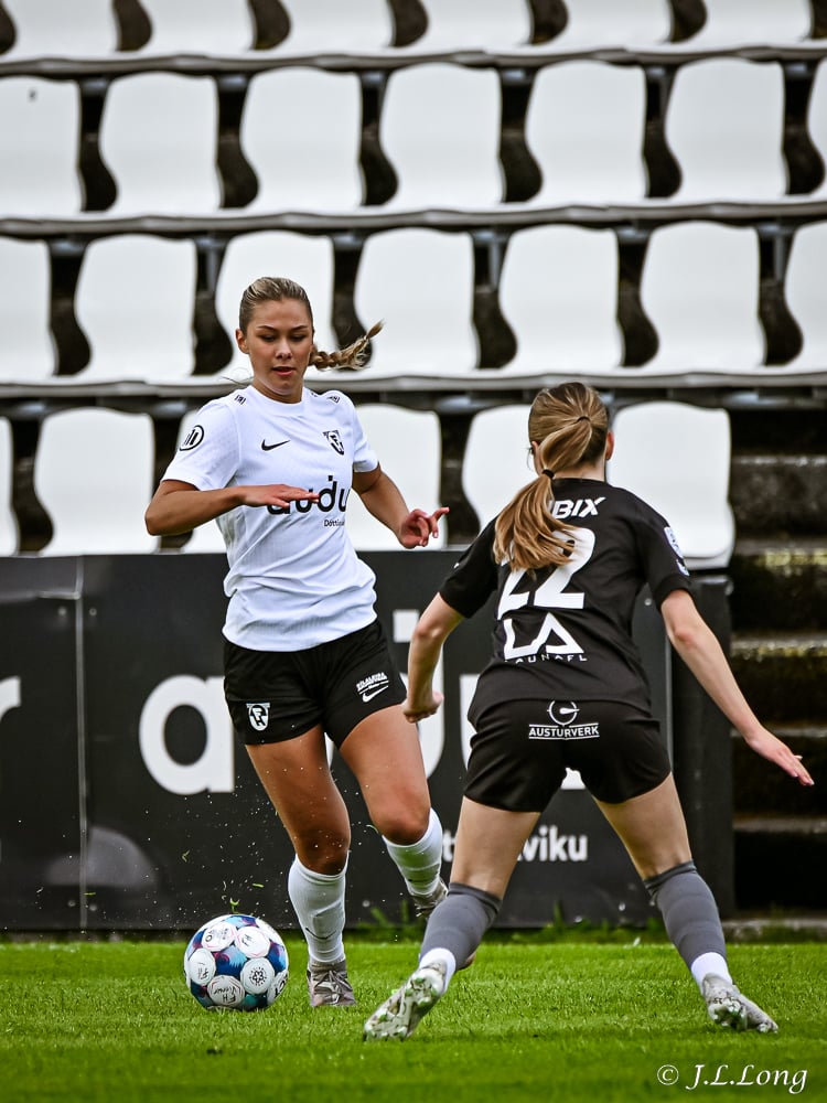 Elísa Lana leikur sér með boltann innan teigs en endar á að eiga skot beint í Mikaleu Nótt og sóknin rennur út í sandinn.