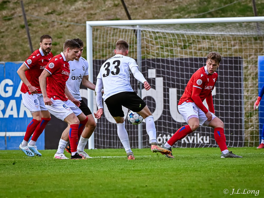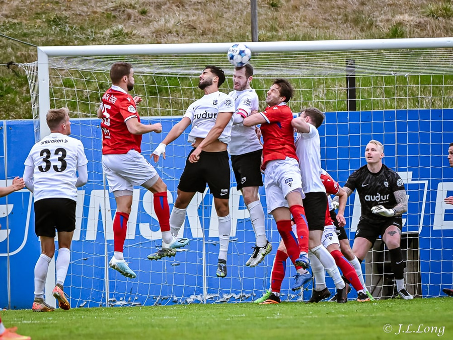 Á sjónvarpsútsendingu sést greinilega að boltinn er á leiðinni framhjá en boltinn fer í Pedersen og í netið. Minn maður Elvar Geir Magnússon er í VAR herbegi .NET.