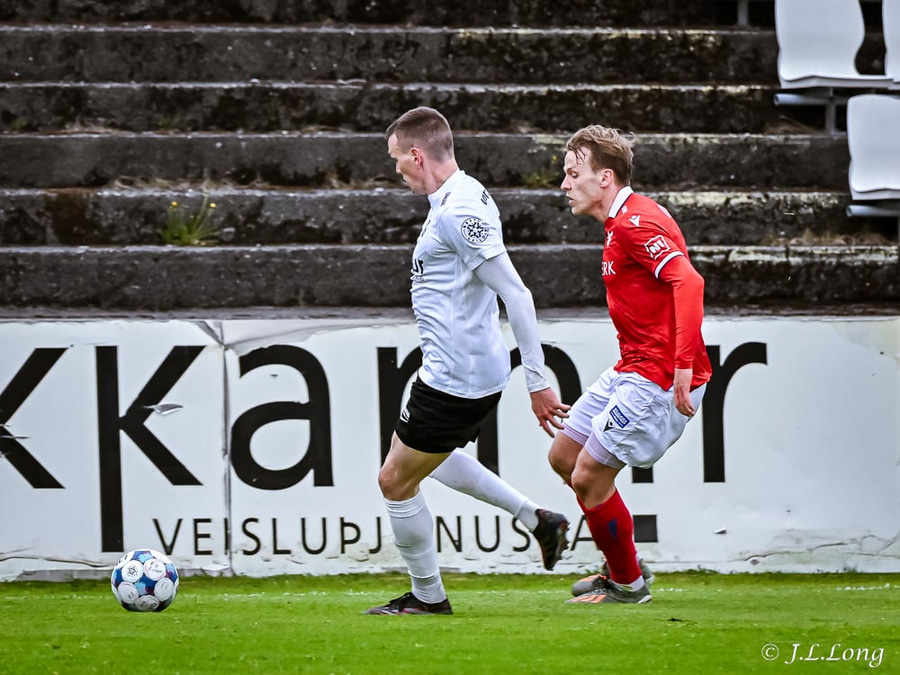 Adam Ægir og Aron Jóhansson með frábæran samleik úti vinstramegin sem endar með því að Adam Ægir á frábæra sendingu inn á teiginn á Lúkas Loga sem setur boltann í slánna.