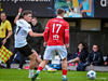 Kjartan Kári er að keyra upp vinstra megin og Tómas Bent hamrar hann niður.