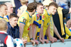 KA menn leiða lukkukrakka inn á völlinn