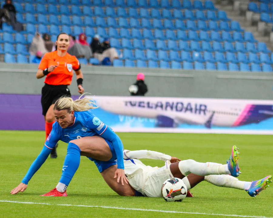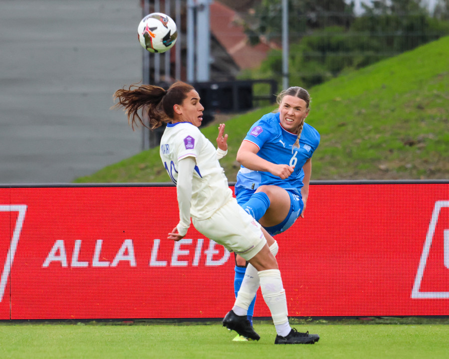 Ísland er að pressa vel á Frakkana á upphafsmínútunum og setja þær í mikil vandræði að komast upp völlinn.