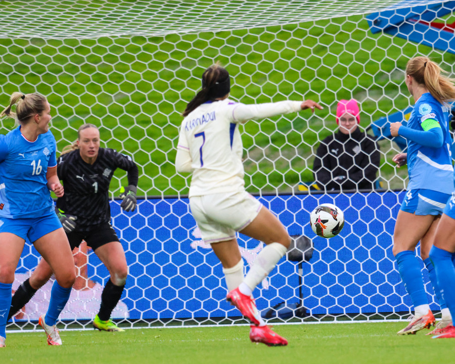 Karólína með fast skot úr aukaspyrnunni, Pauline ver þetta beint fyrir fæturna á Glódísi sem setur boltann í hliðarnetið.