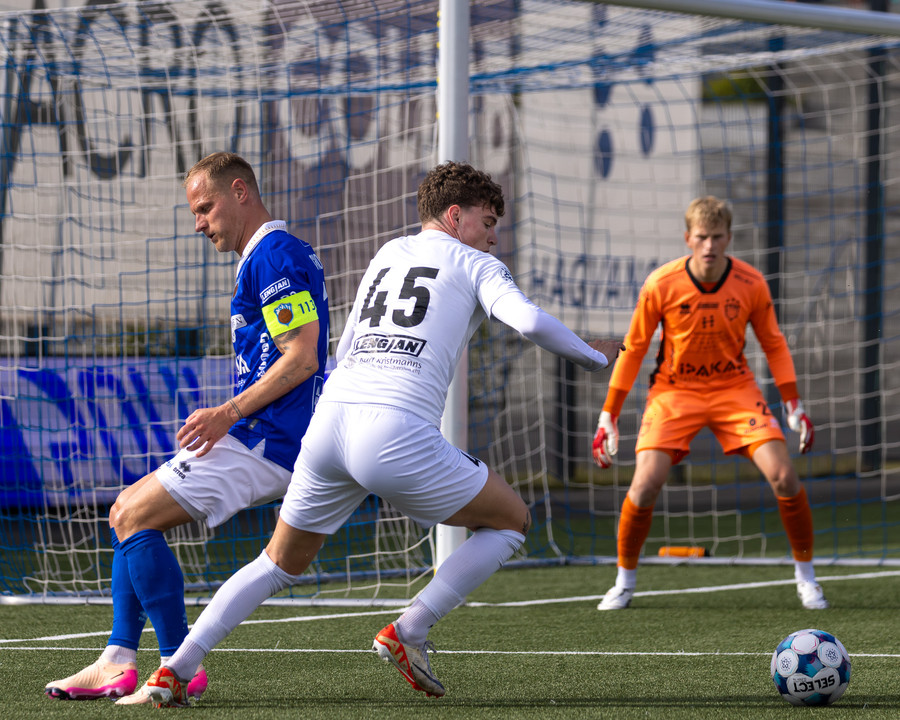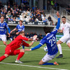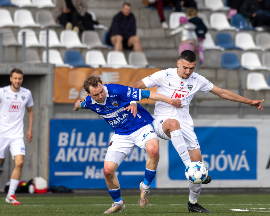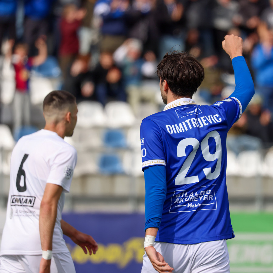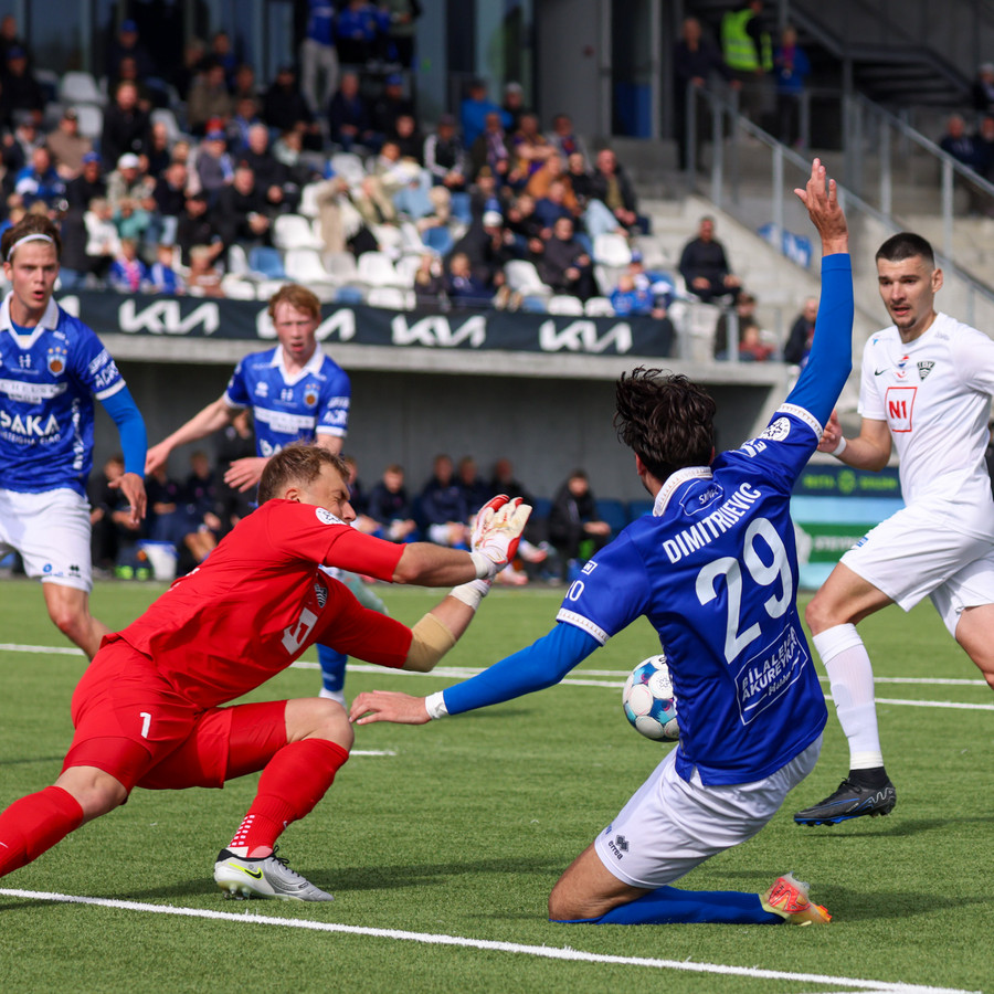 Langur bolti upp völlinn á Magnús Inga sem er kominn einn í gegn. Jovan Mitrovic gerir vel í að elta hann og nær góðri tæklingu þar sem hann tæklar boltann í Magnús. Marcel kemur úr markinu og er á undan Magnúsi í boltann.