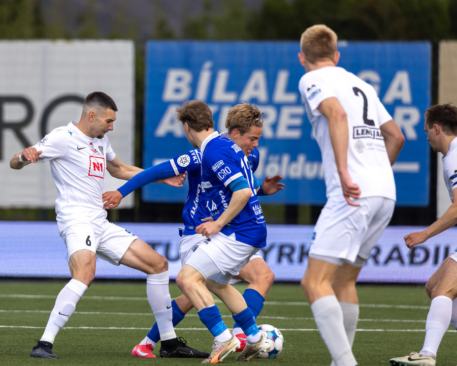 Jovan kemur boltanum upp á Sverri Pál sem keyrir í átt að markið. Hann reynir skotið úr frekar þröngu færi sem fer í varnarmann og aftur fyrir.