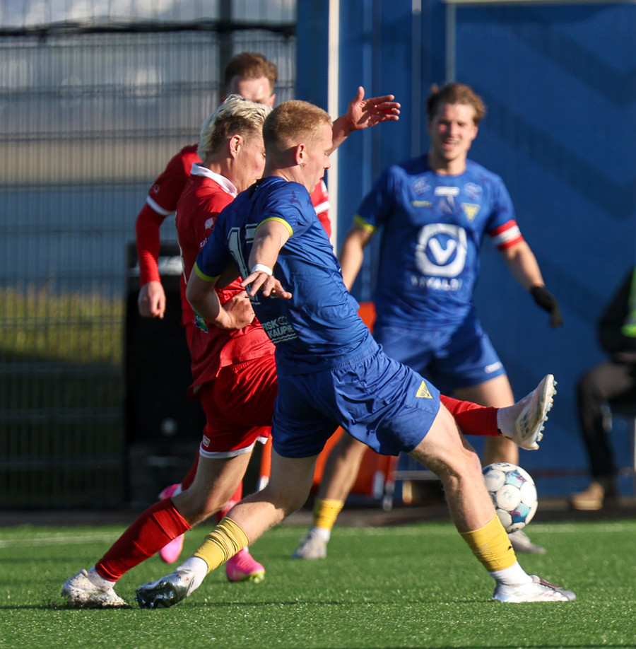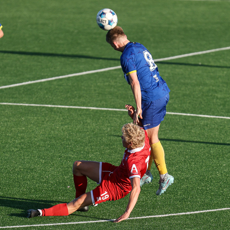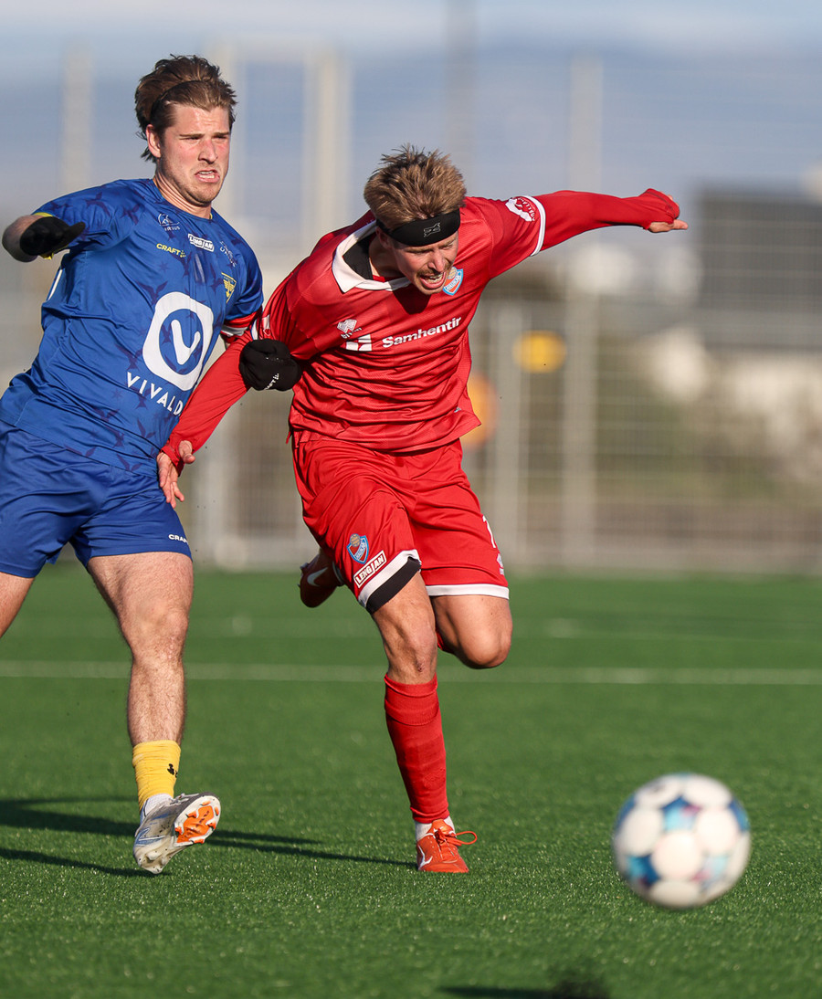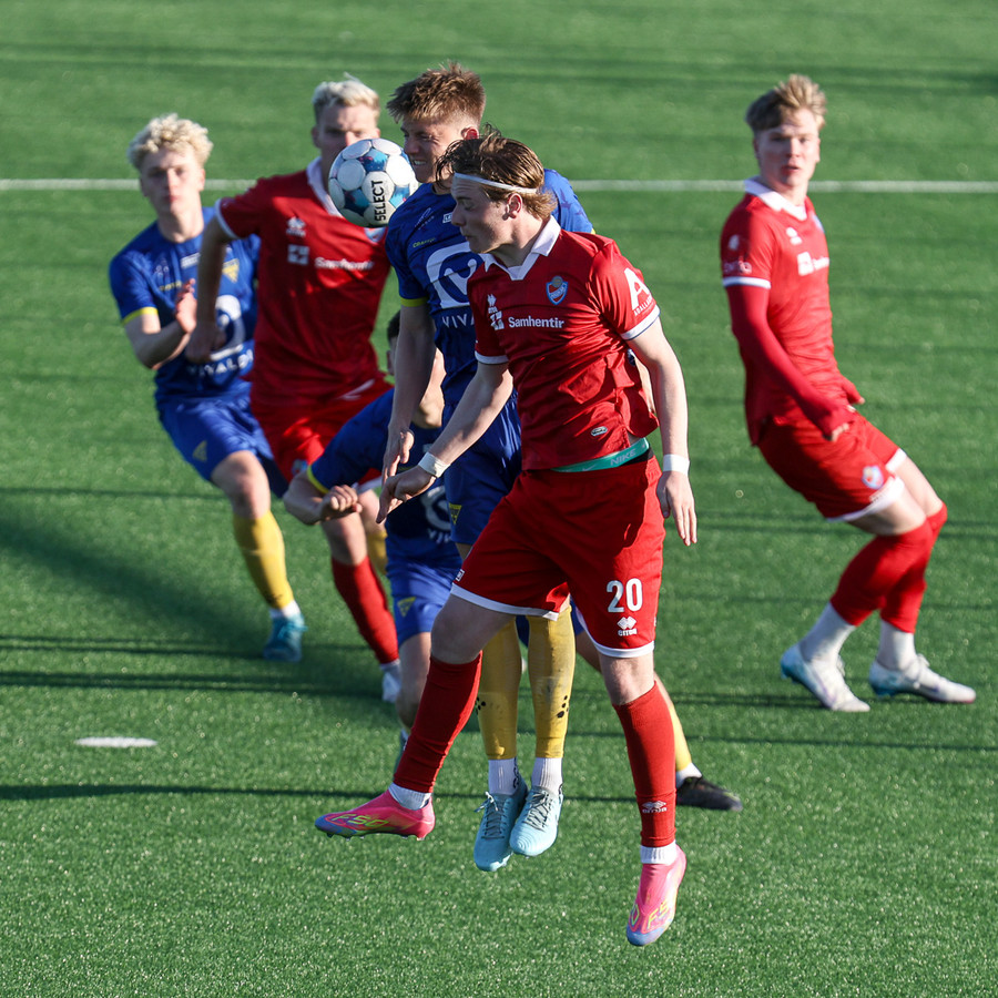 Hættulegur bolti frá Kristófer Melsted en Axel kemst ekki í boltann inn á markteignum.