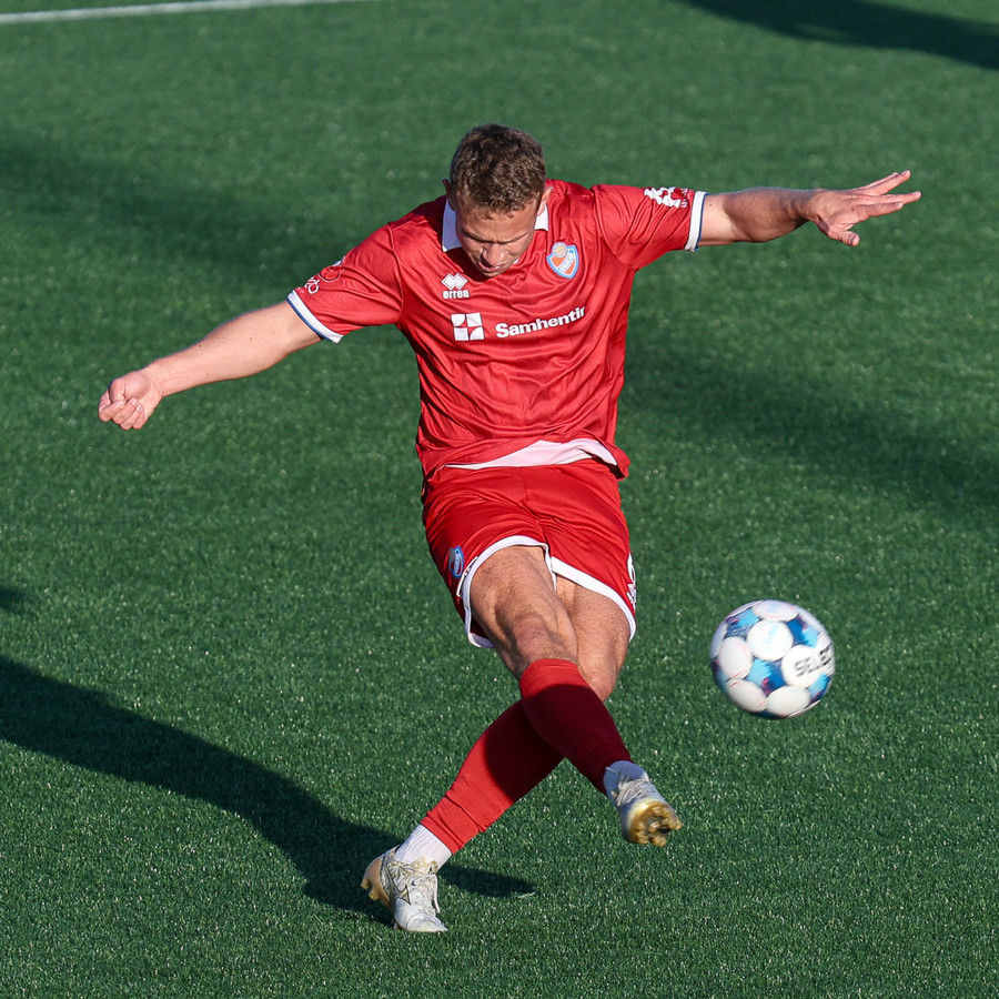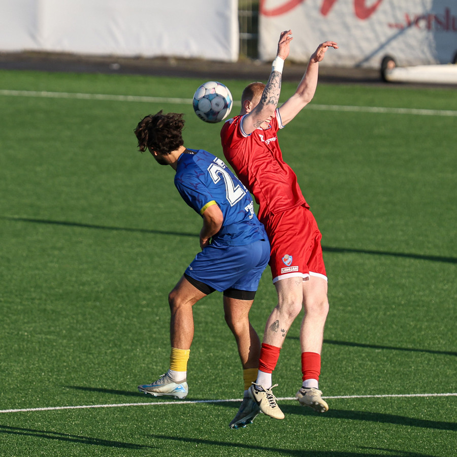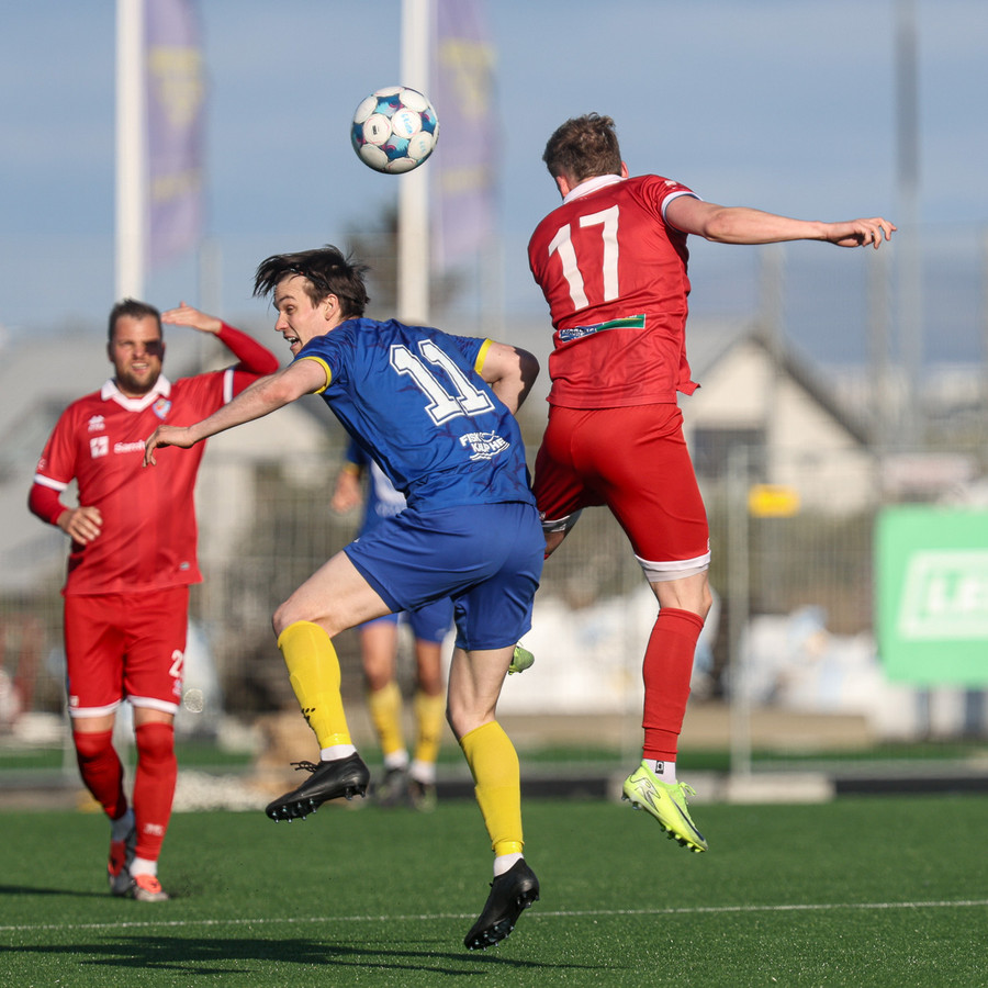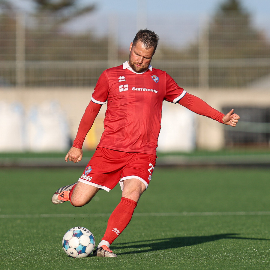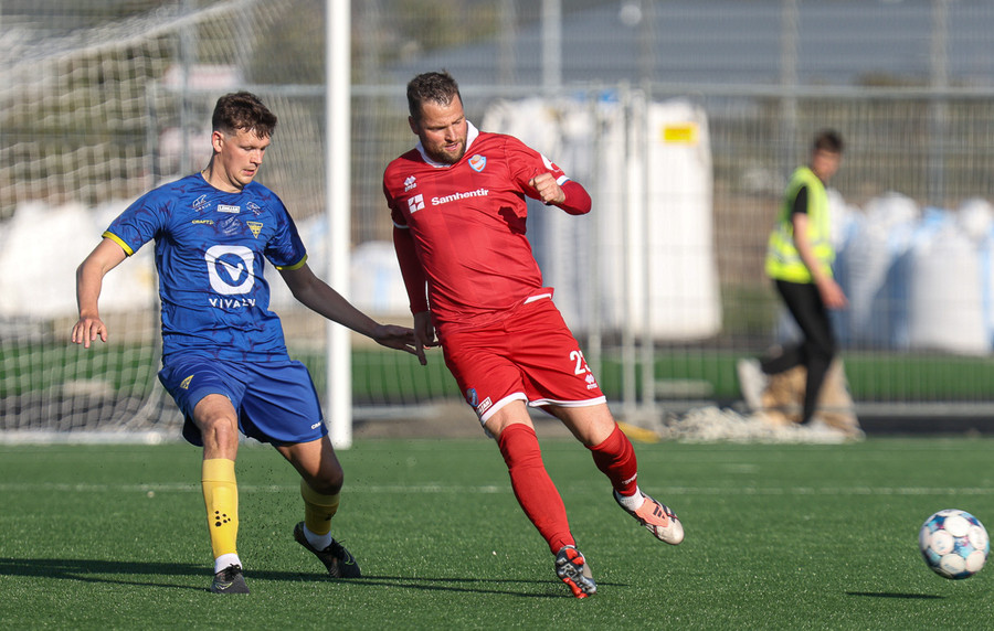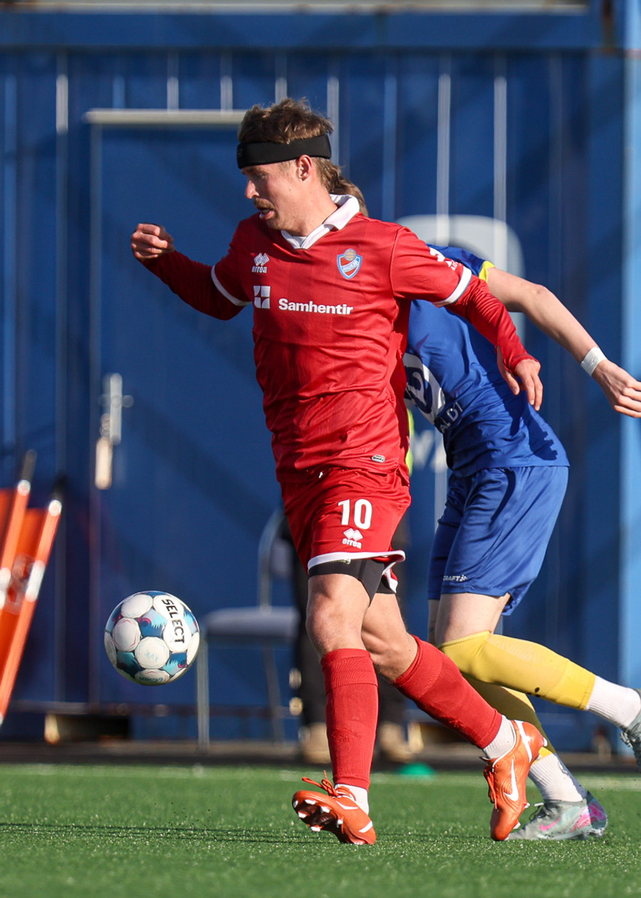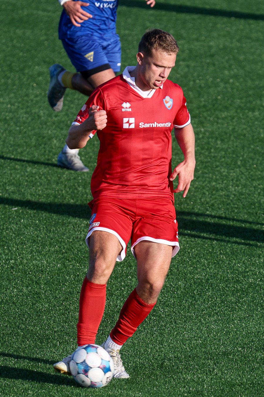 Aron Bjarni Arnórsson með bjartsýnistilraun vel fyrir utan teig sem flýgur hátt yfir mark gestanna.