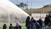Það er frábært veður, glampandi sól og leikmenn spila á gervigrasi sem var lagt fyrr í sumar. Þetta gæti orðið alvöru partí.
