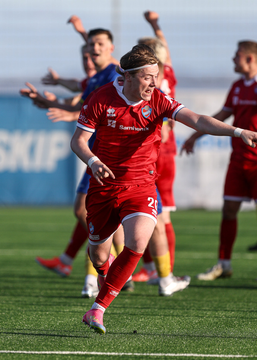 Flott sókn hjá gestunum og Fannar Óli Friðleifsson á tilraun en hittir ekki markið eftir fyrirgjöf frá hægri.