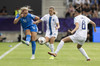 Guðný Árnadóttir geysist upp hægri vænginn. Með tíma og pláss reynir hún fyrirgjöf en Finnar bjarga.
