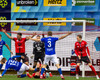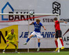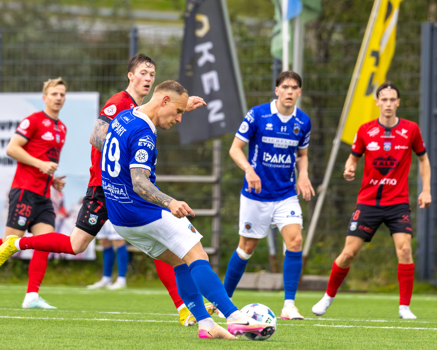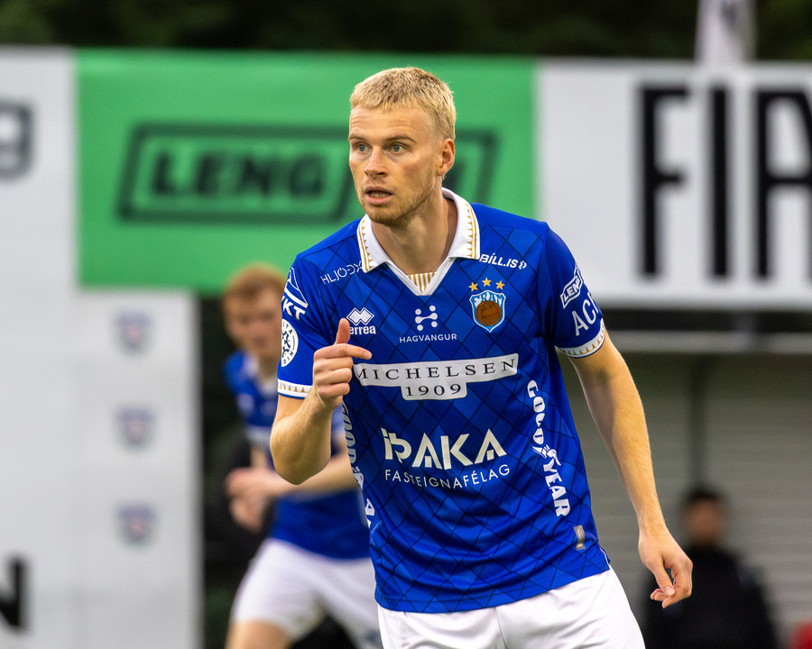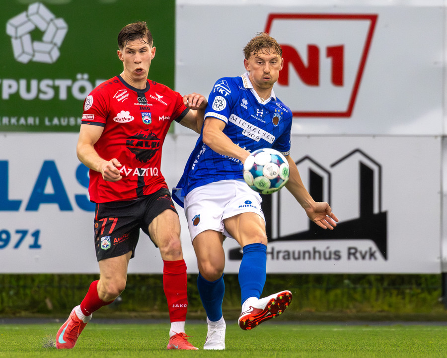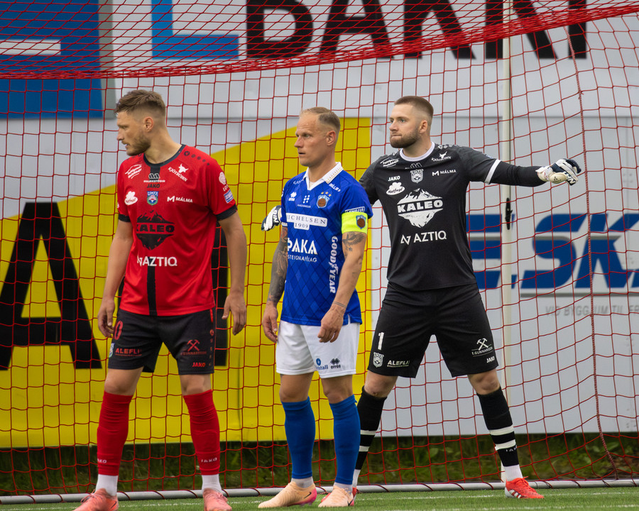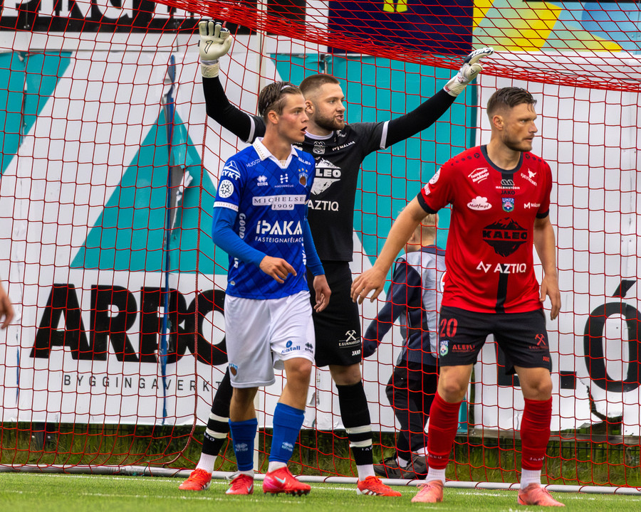 Jökull sendir boltann frá sér á hættulegum stað, Tibbling keyrir af stað og reynir skot fyrir utan teiginn sem Jökull ver.