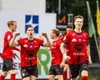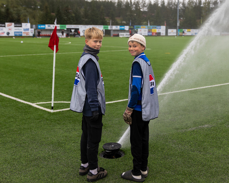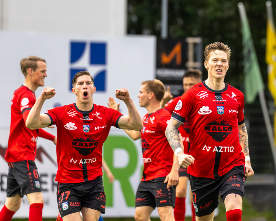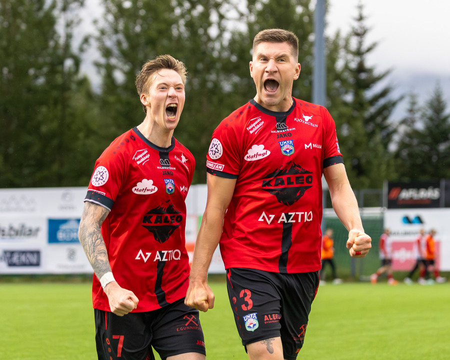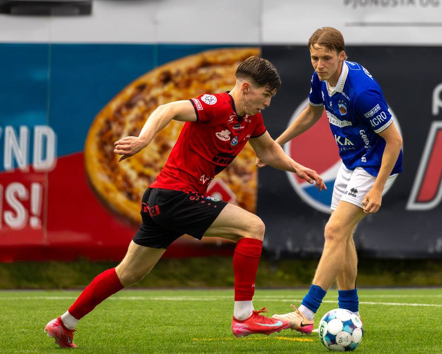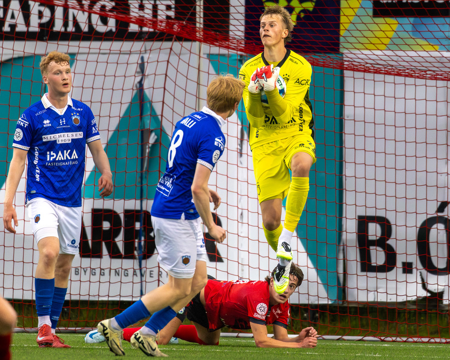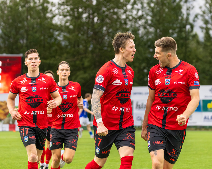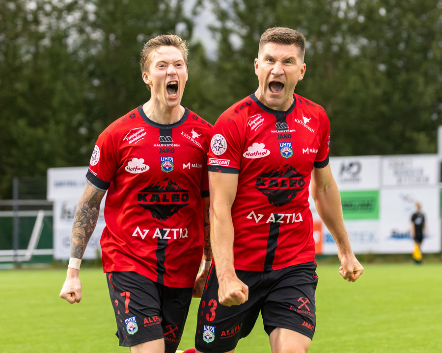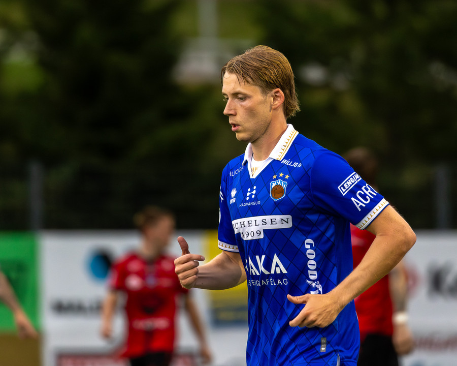 Hrannar Snær gerir stórkostlega úti vinstra meginn og kemur boltanum fyrir á Stokke. Hann tíar boltann upp fyri Aron sem klárar glæsilega framhjá Viktori og kemur Mosfellingum yfir.