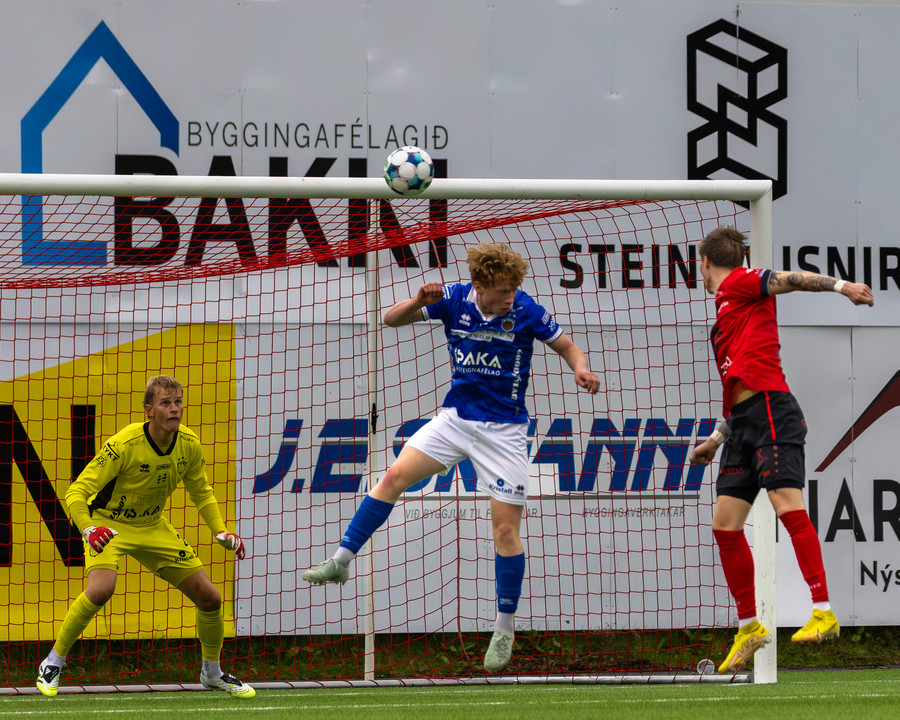 Langt innkast inn á teiginn sem Axel Óskar skallar á fjærstöngina þar sem Aron Jóh er. Boltinn fór yfir Viktor í markinu og Aron með markið fyrir framan sig en skallar í Framara og aftur fyrir.