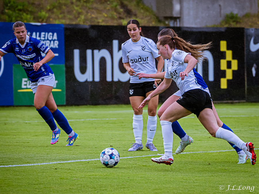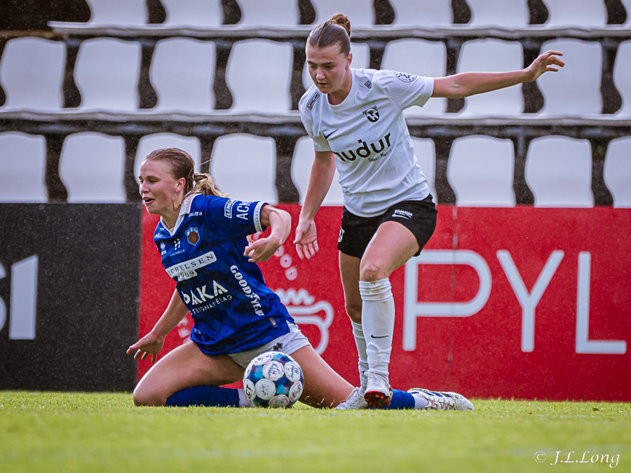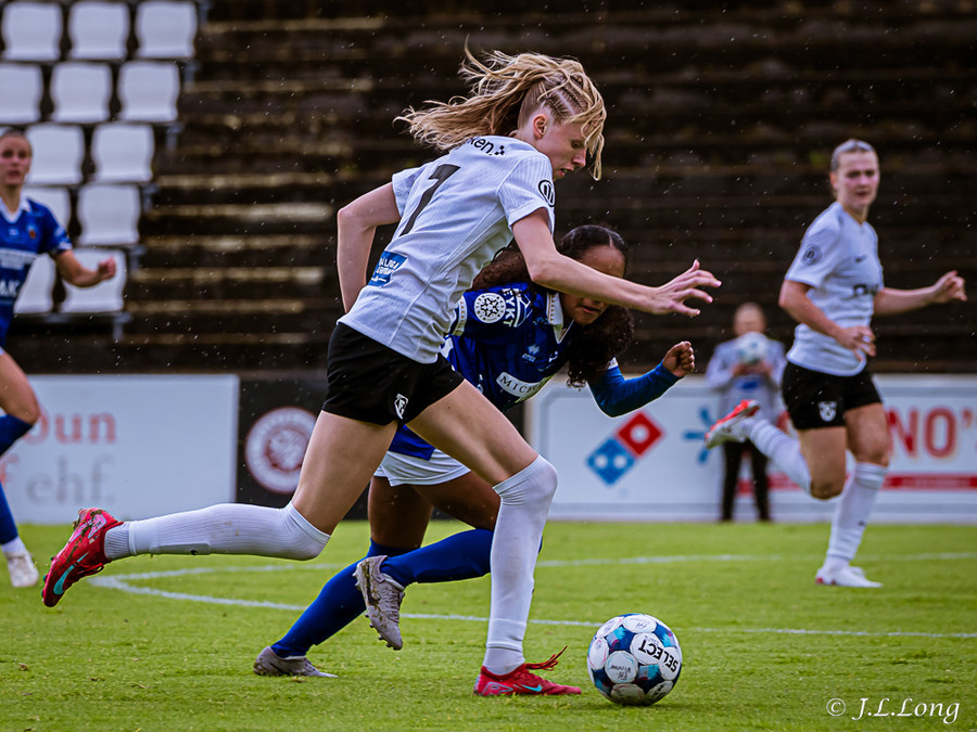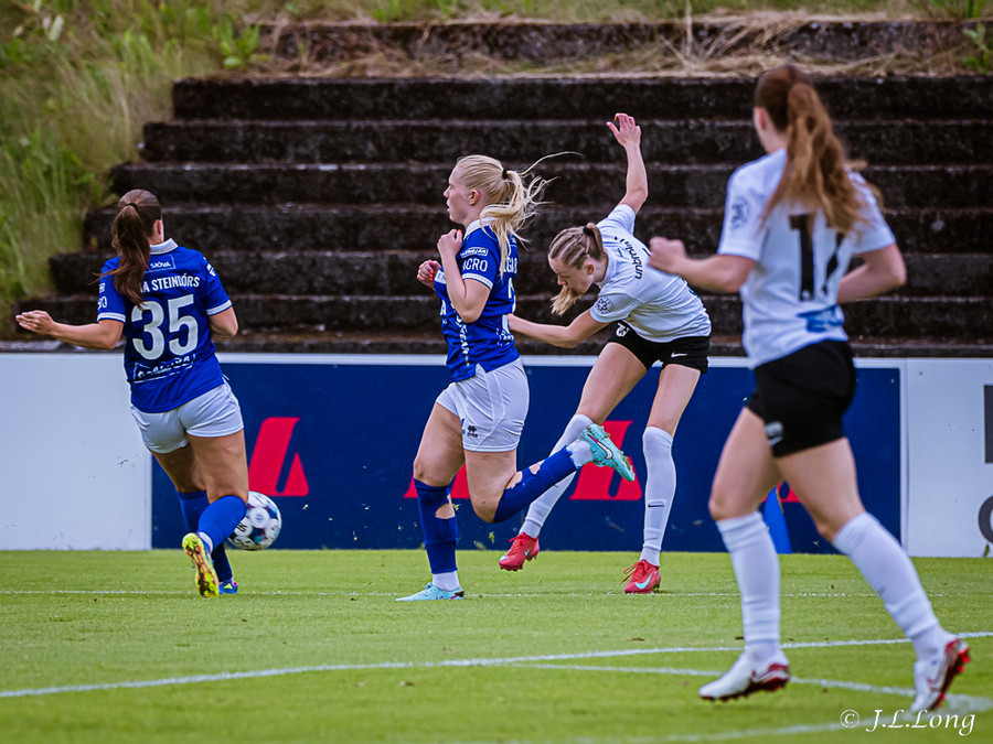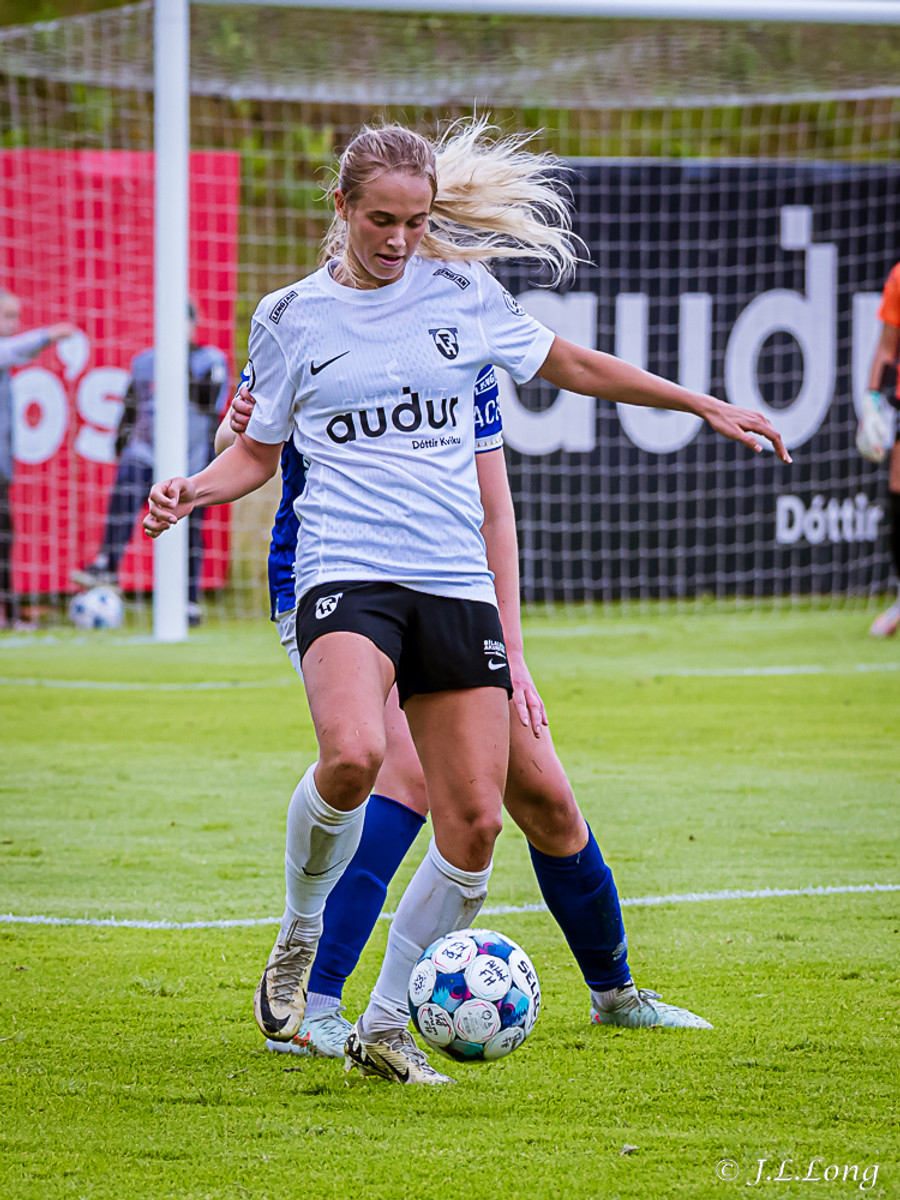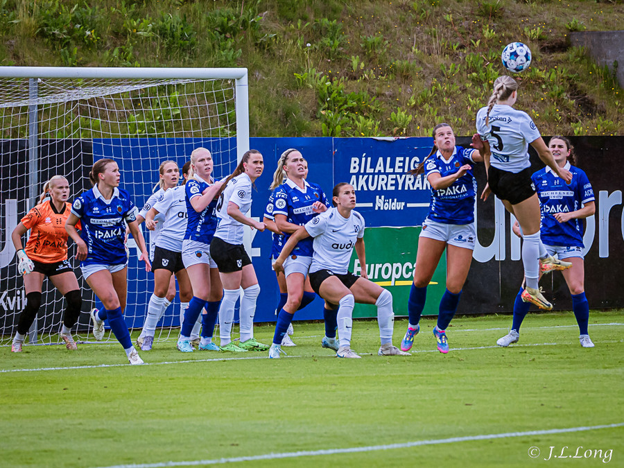 Elísa með góða fyrirgjöf á Valgerði sem á skalla beint á markið og Þóra Rún grípur boltann