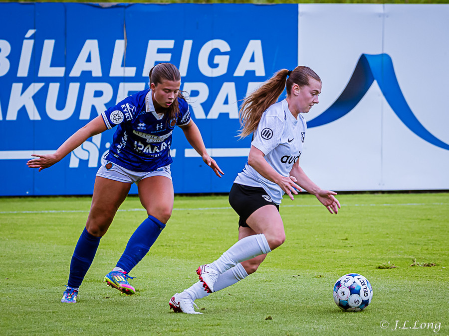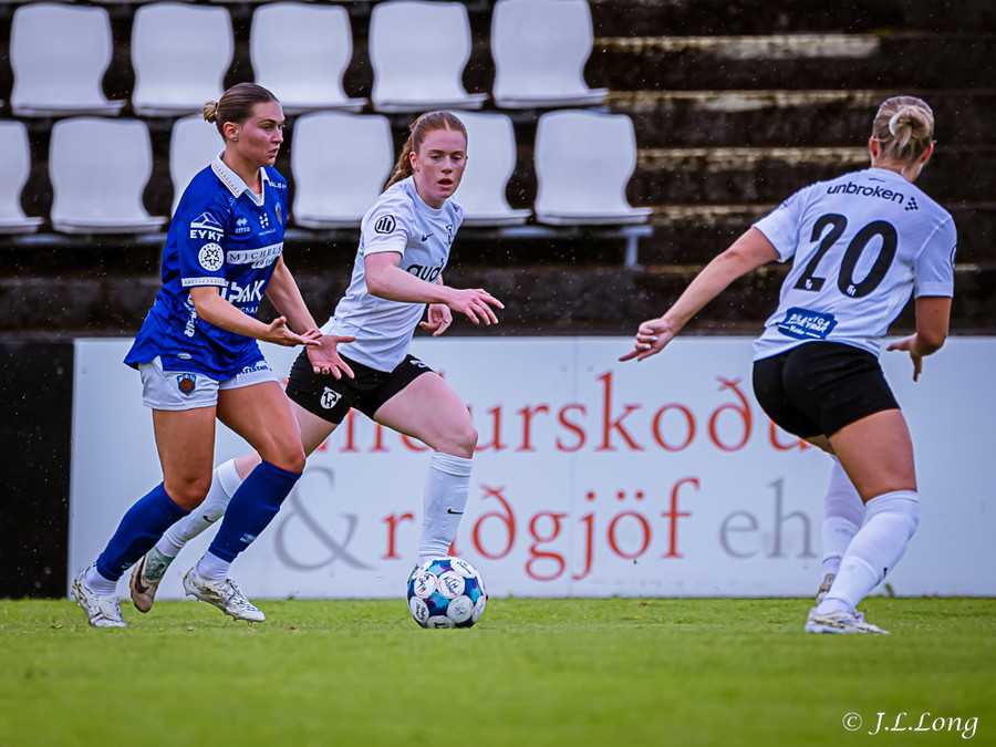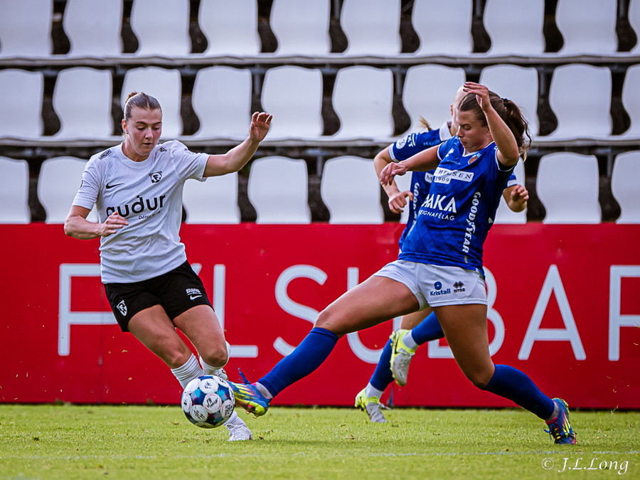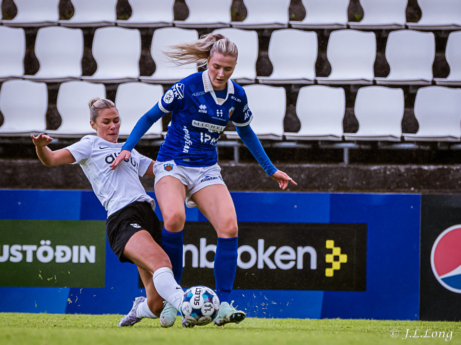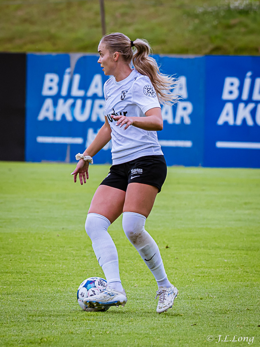Elísa með góða fyrirgjöf á Valgerði sem á skalla beint á markið og Þóra Rún grípur boltann