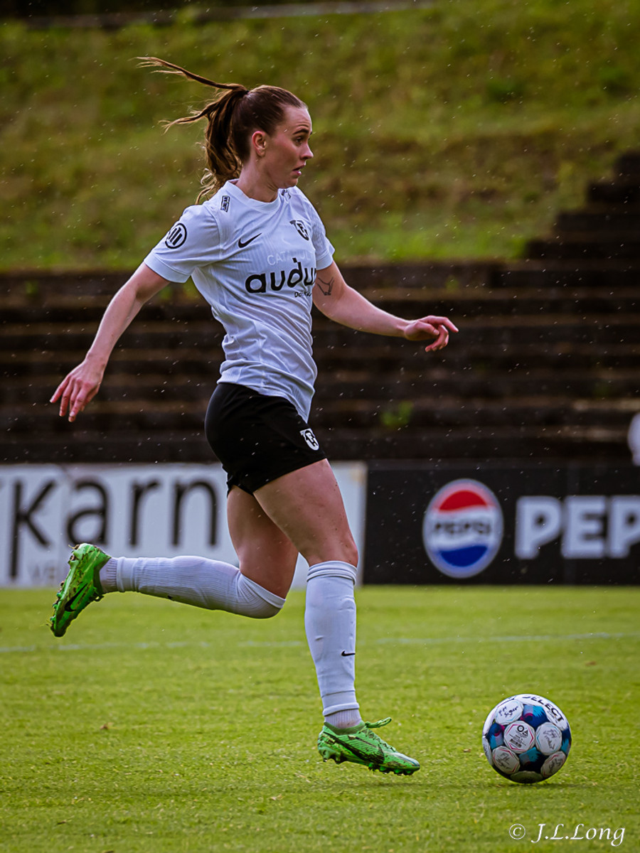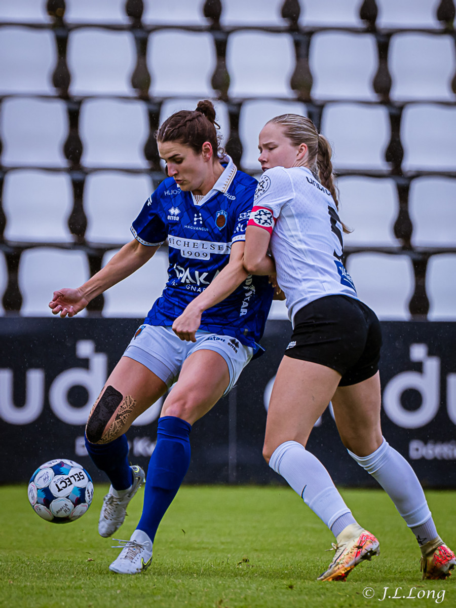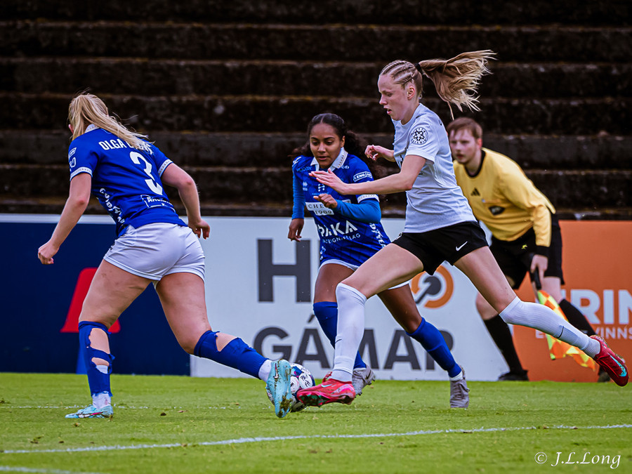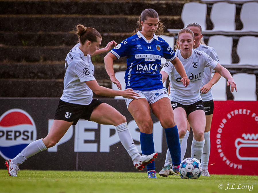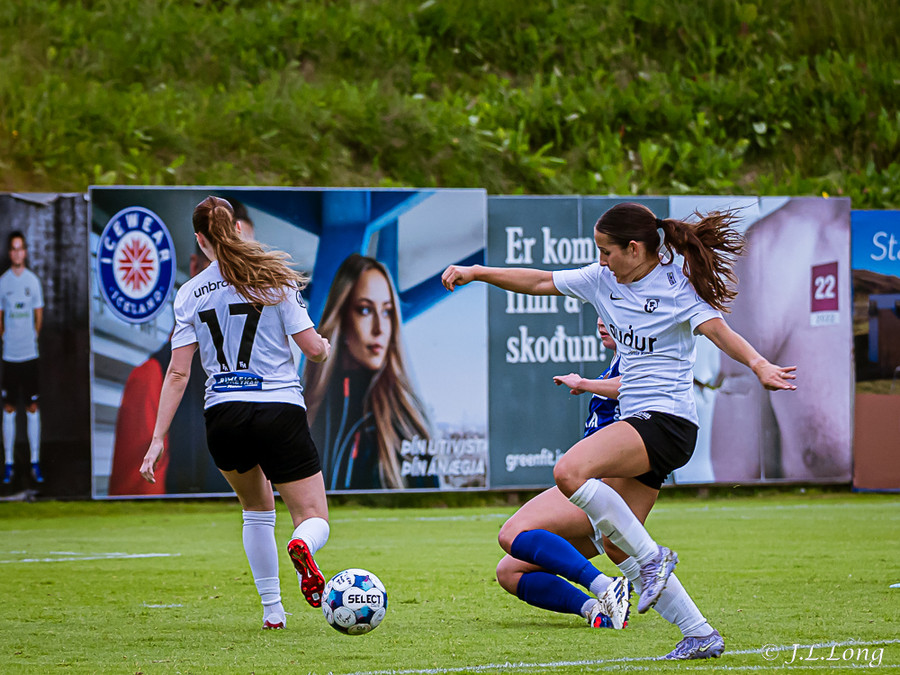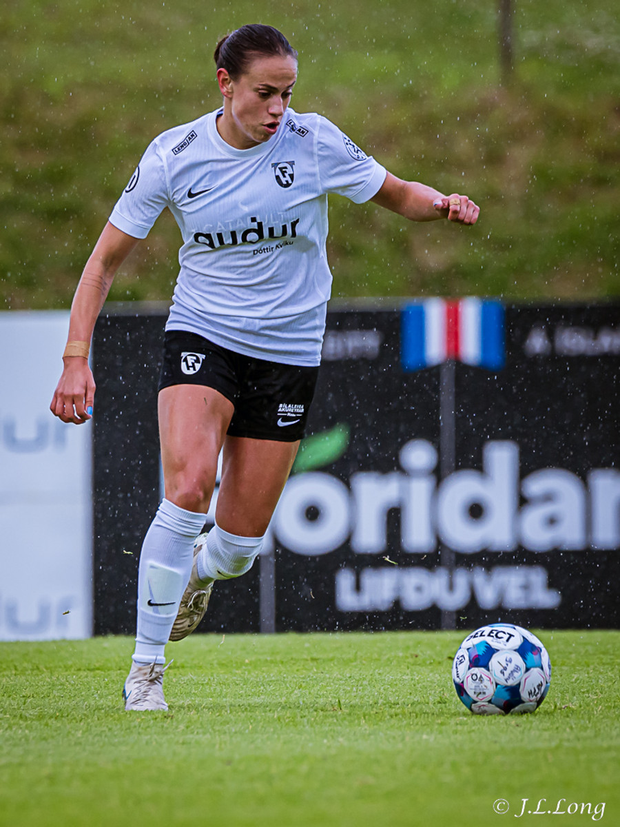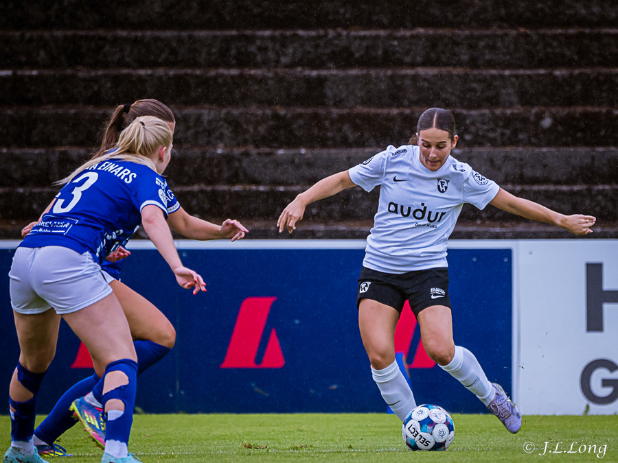 Murielle reynir skot rétt inn í teig en Deja kemst fyrir og kemur boltanum burt.