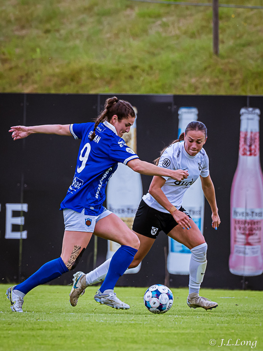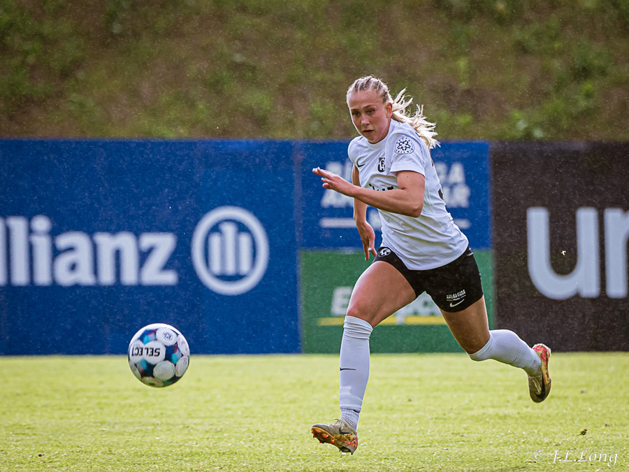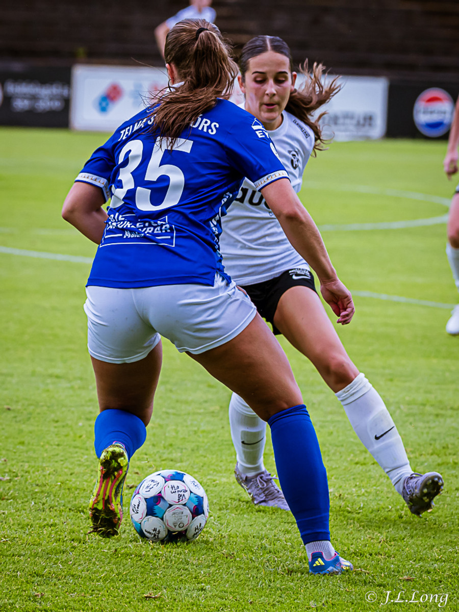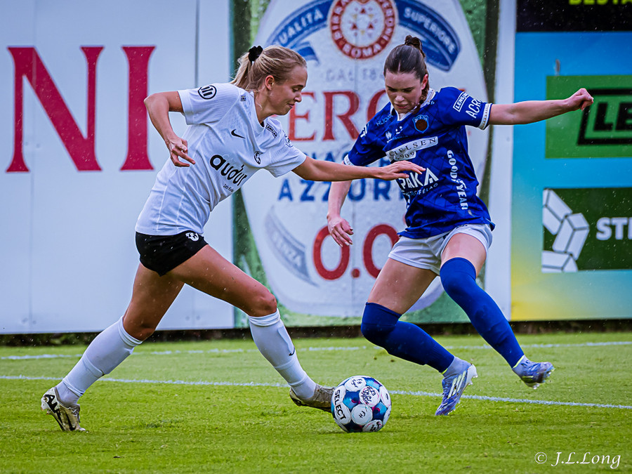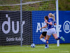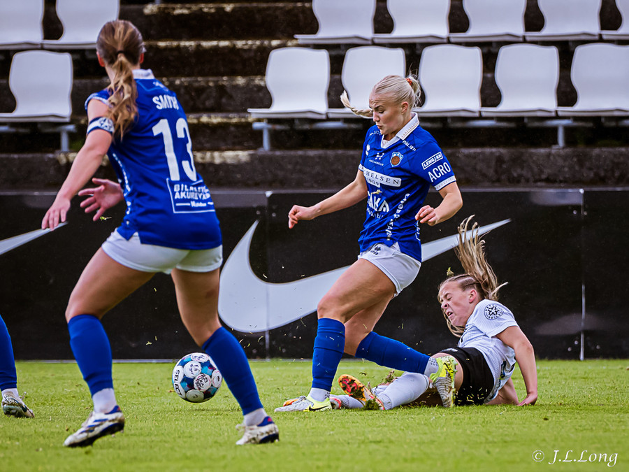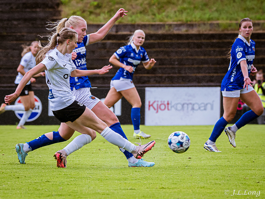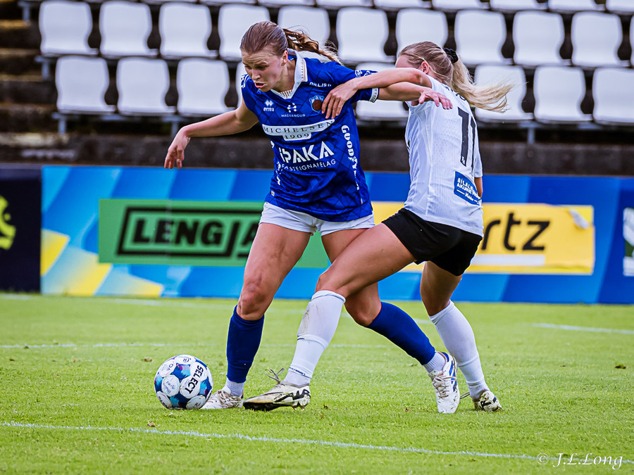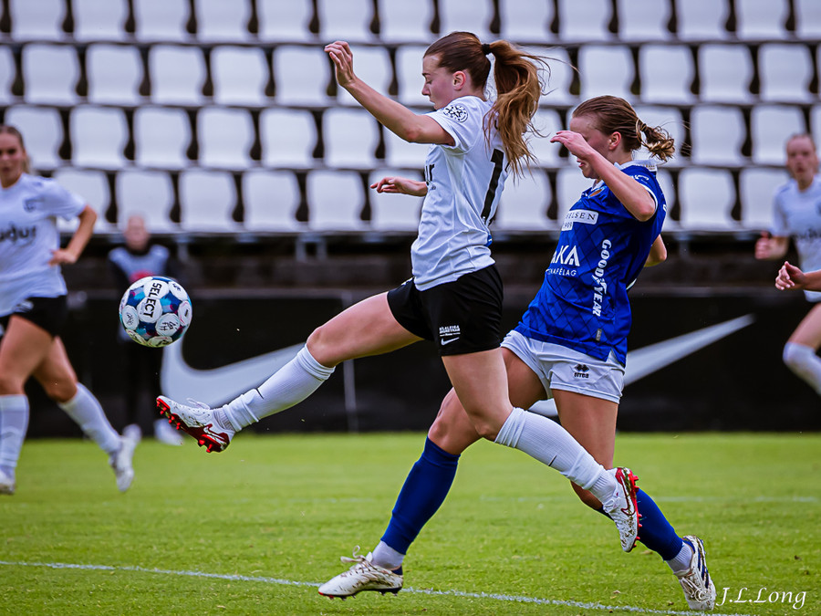 Murielle reynir skot rétt inn í teig en Deja kemst fyrir og kemur boltanum burt.