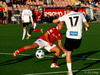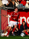 Langur bolti fram og allt í einu er Tryggvi bara einn gegn markmanni. Hann reynir að vippa yfir Rosenörn en nær ekki nægilegri hæð á skotið og Rosenörn grípur.