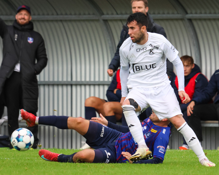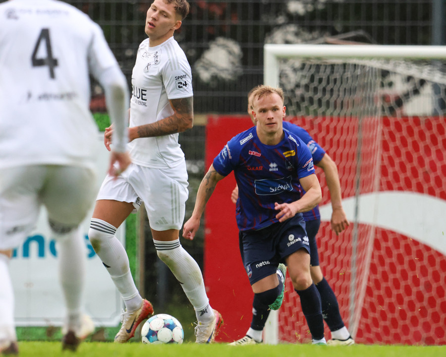 Sindri hoppar og kýlir boltann en hann fær Djorde í sig á meðan og liggur stutt niðri.