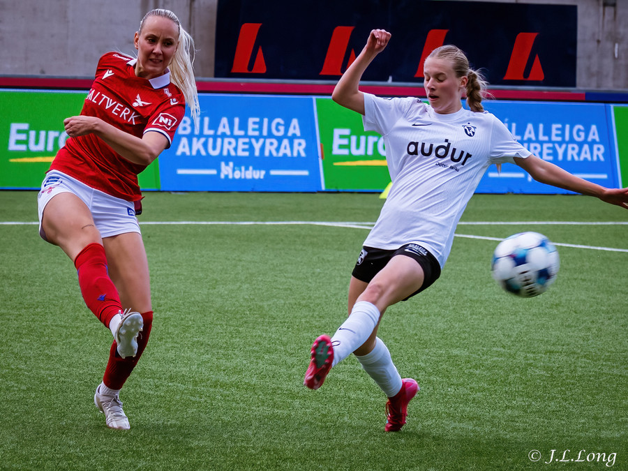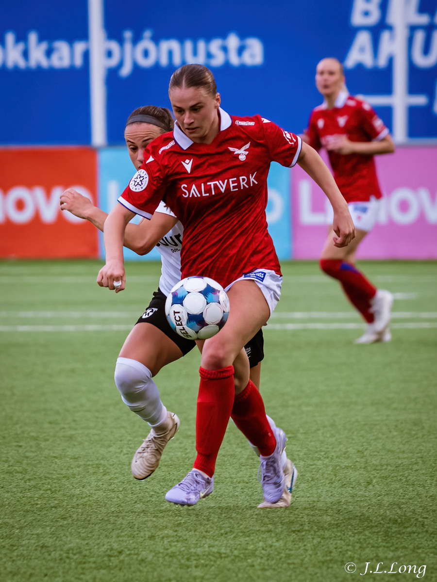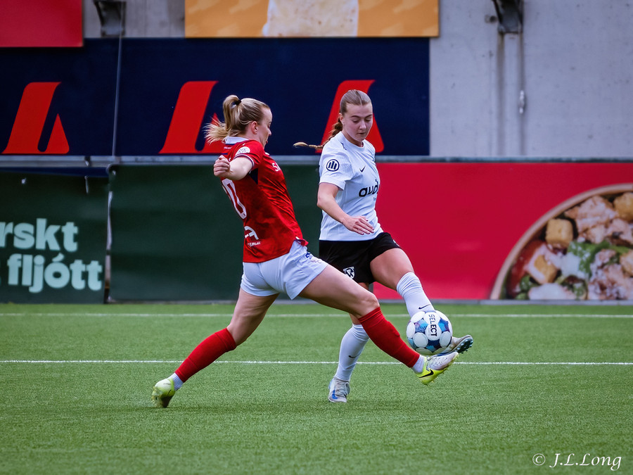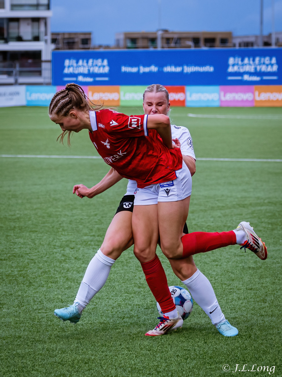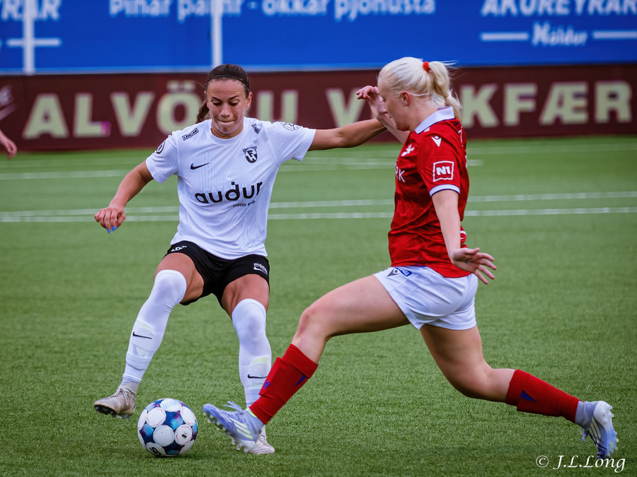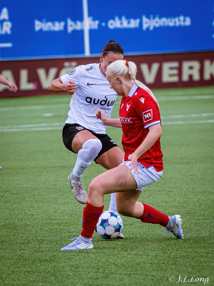 Boltinn berst upp á Mayu sem keyrir með hann upp en Lillý Rut gerir þetta ógeðslega vel, hægir á henni og nær síðan að pikka boltanum frá henni