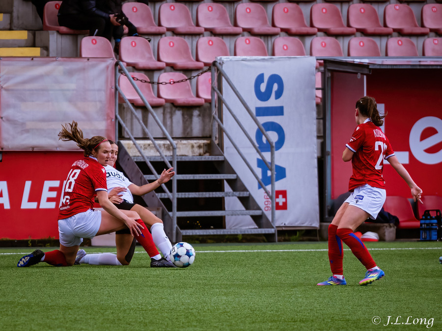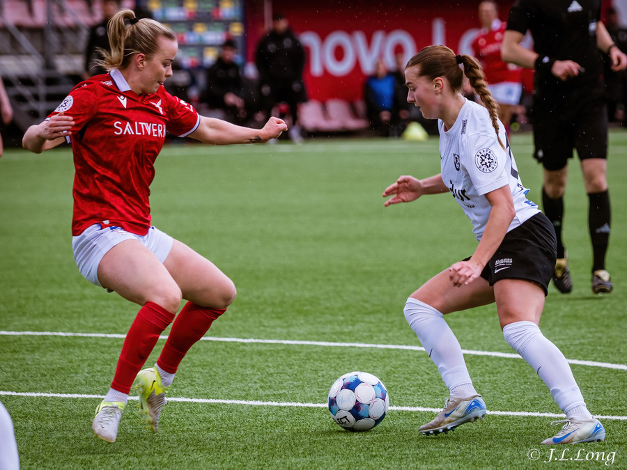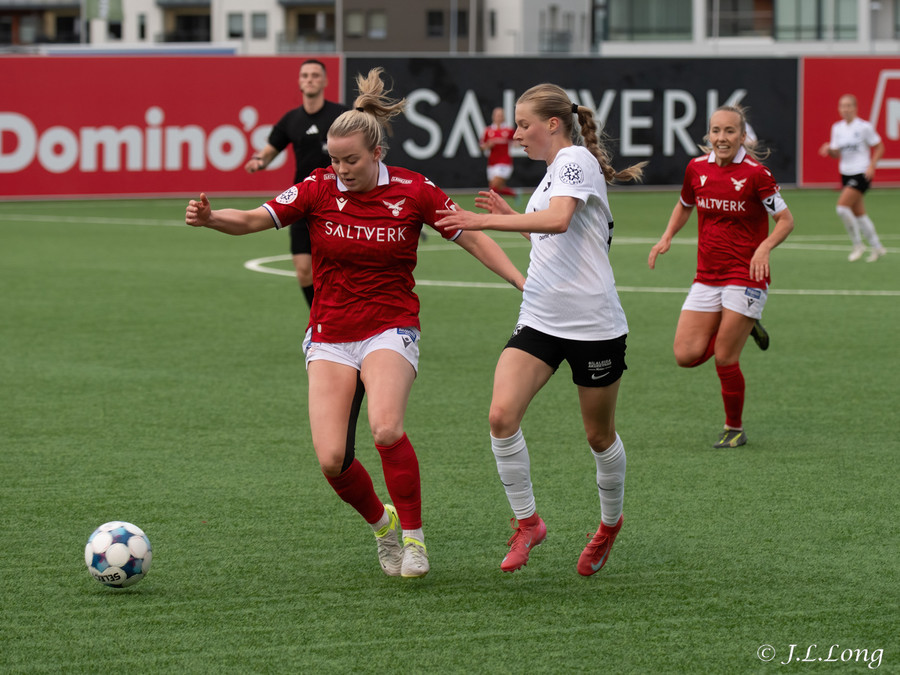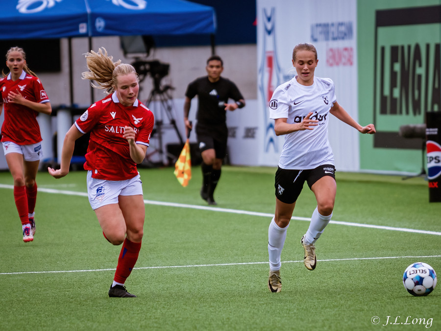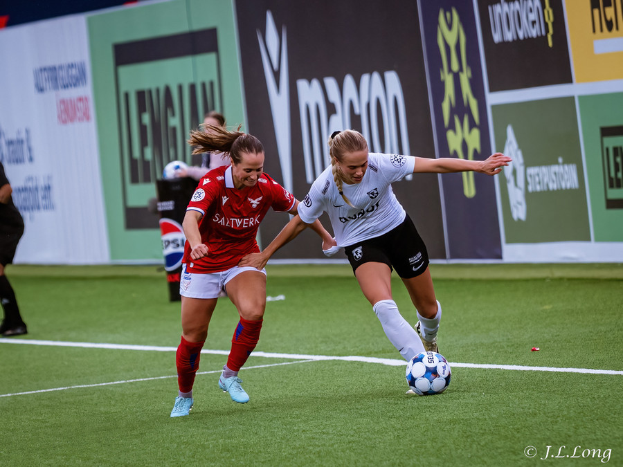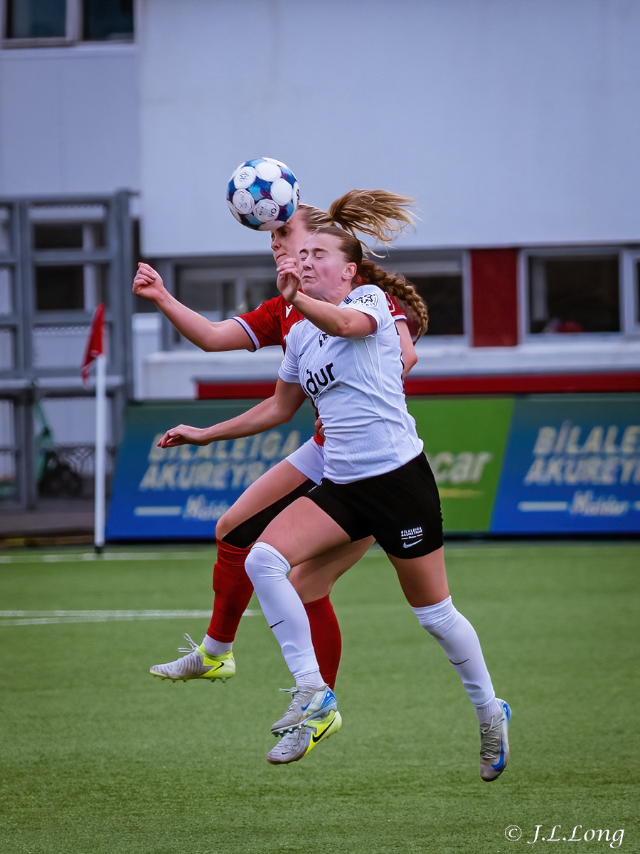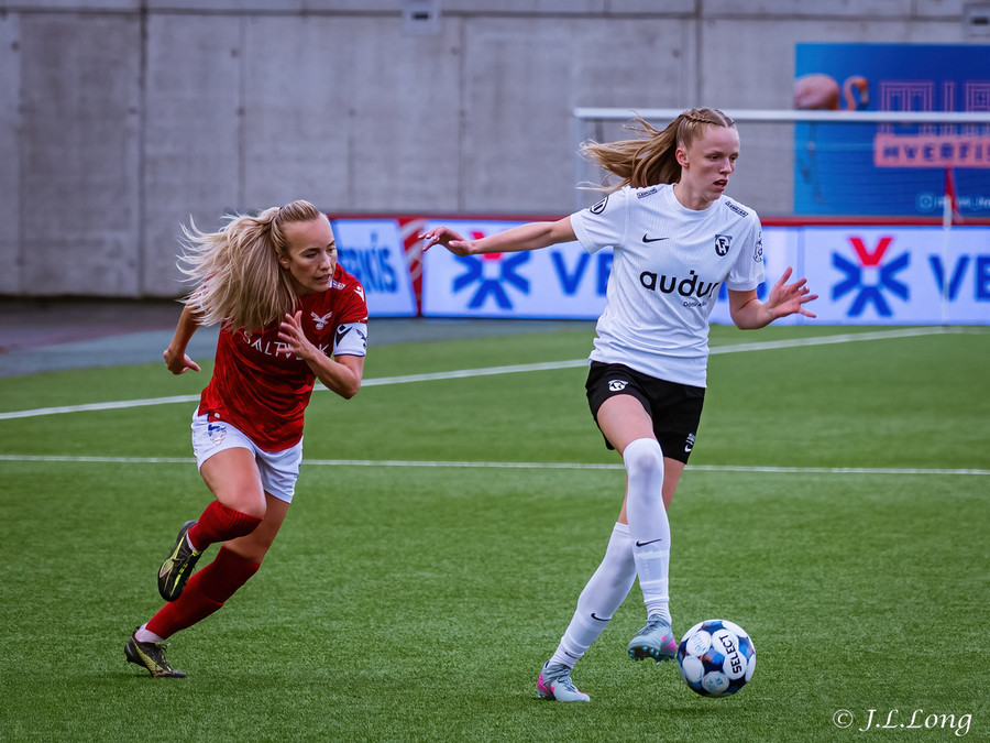 Boltinn berst upp á Mayu sem keyrir með hann upp en Lillý Rut gerir þetta ógeðslega vel, hægir á henni og nær síðan að pikka boltanum frá henni