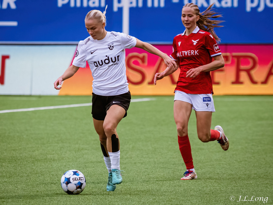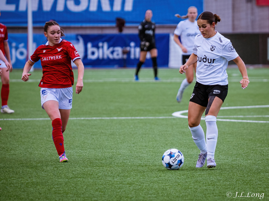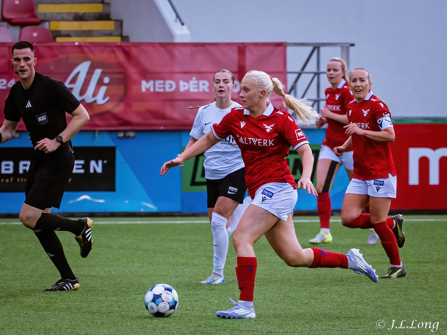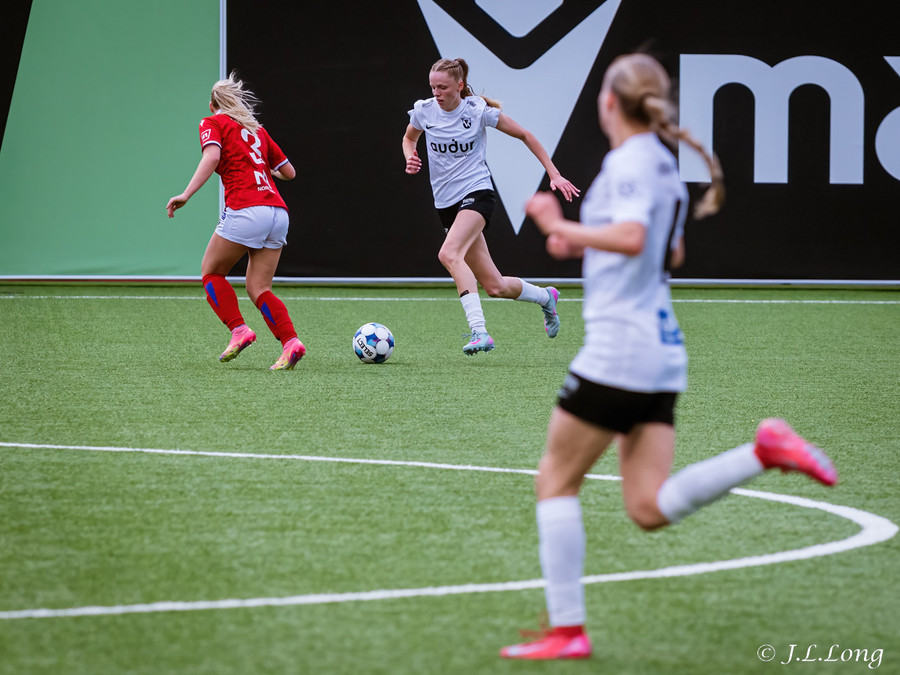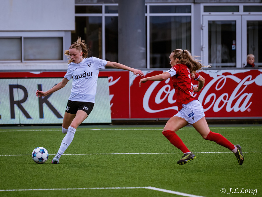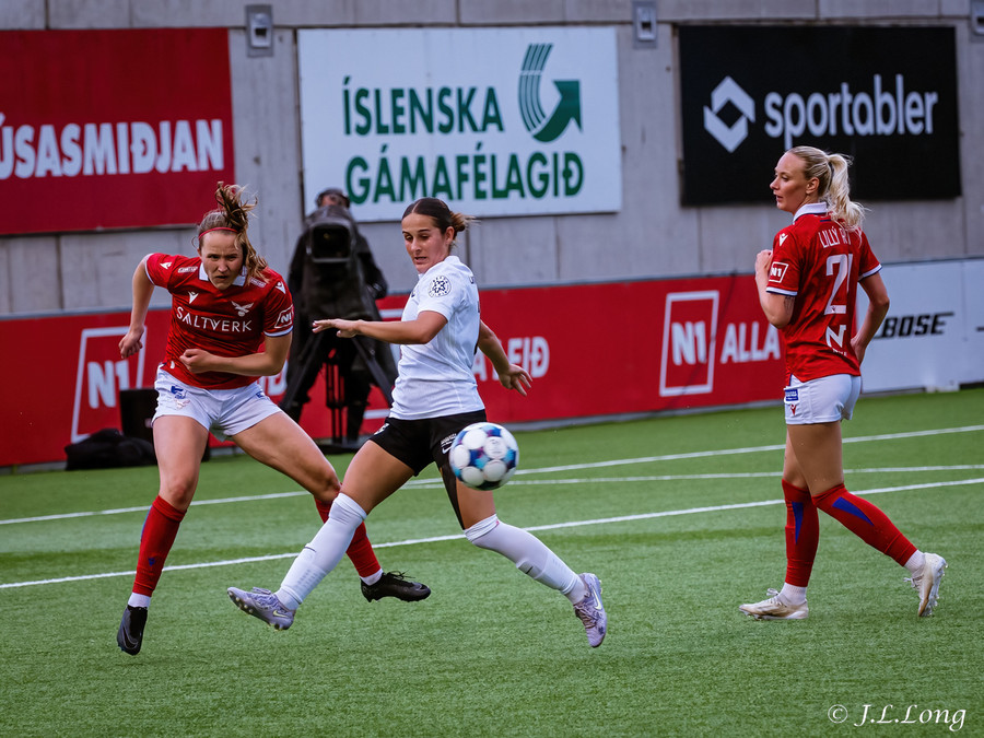 Maya stingur boltanum inn á Margréti Brynju hún með gabbhreyfingarnar á hreinu endar síðan með lélegu skoti eða fyrirgjöf? Eiginlega ómögulegt að segja til um hvort... Boltinn allavega útaf