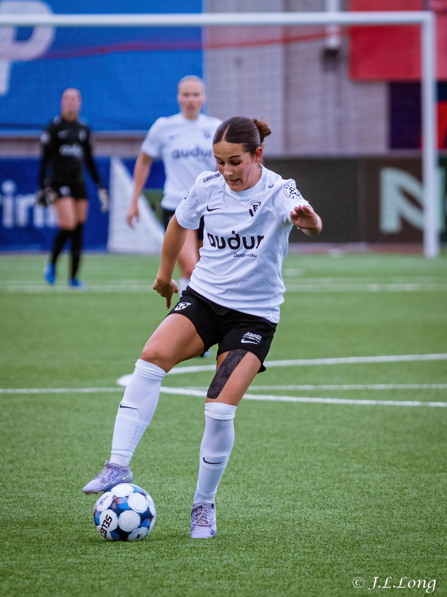 Darraðardans í teignum hjá FH, Elín á svo skot í varnamann og afturfyrir endalínu, munaði engu að hún næði að jafna og setja sitt annað mark