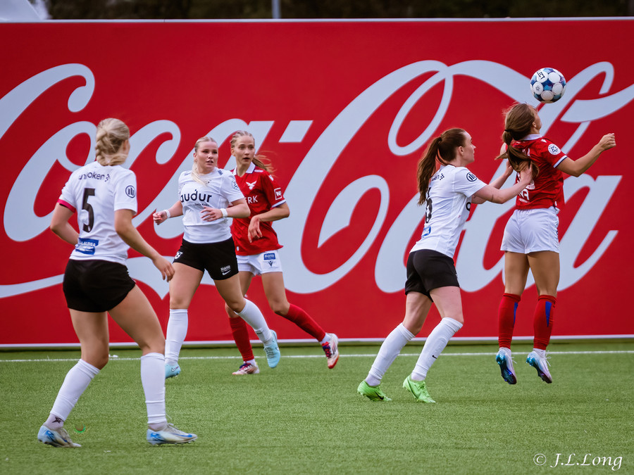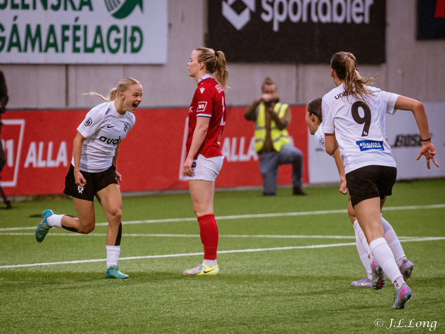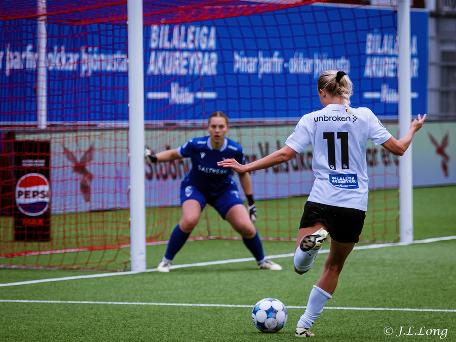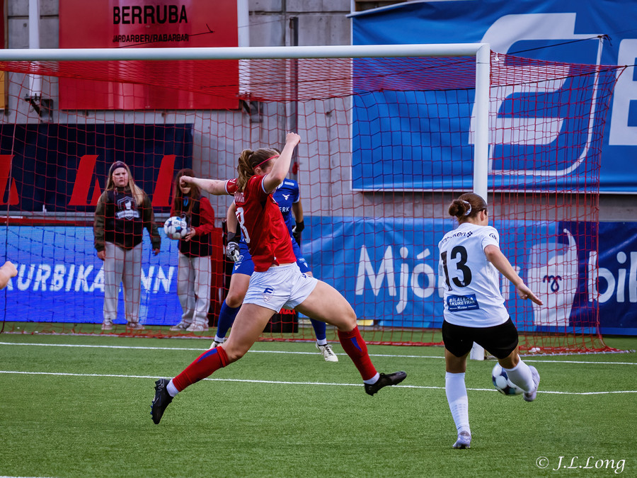 Frábær sending upp á Thelmu Karen sem á góða fyrirgjöf en Berglind Freyja nær hins vegar ekki til boltans