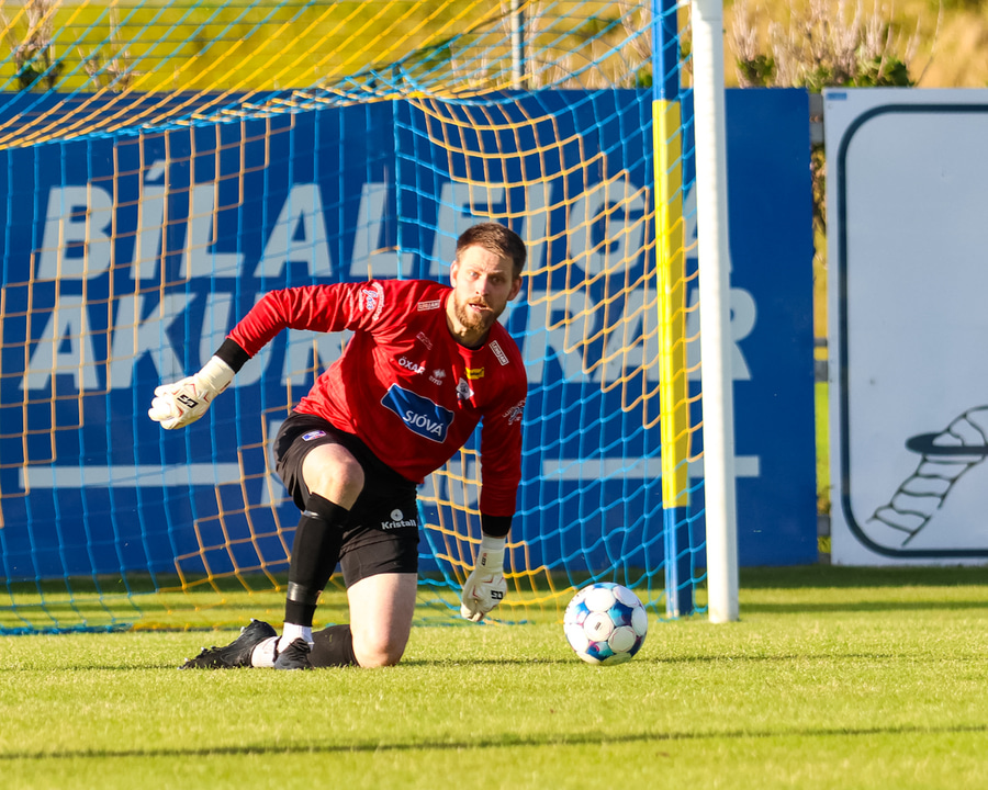Adam Árni nær skoti úr erfiðri stöðu en það er auðveld fyrir Óla að grípa það. Allt í einu liggur mark í loftinu fyrir Grindavík.