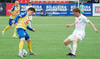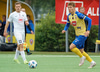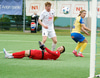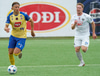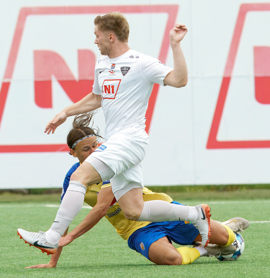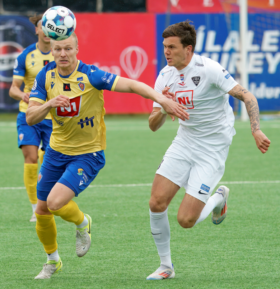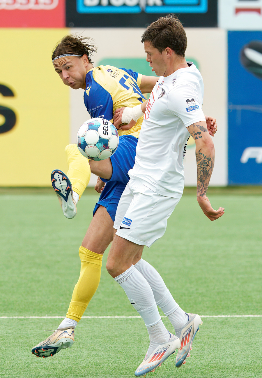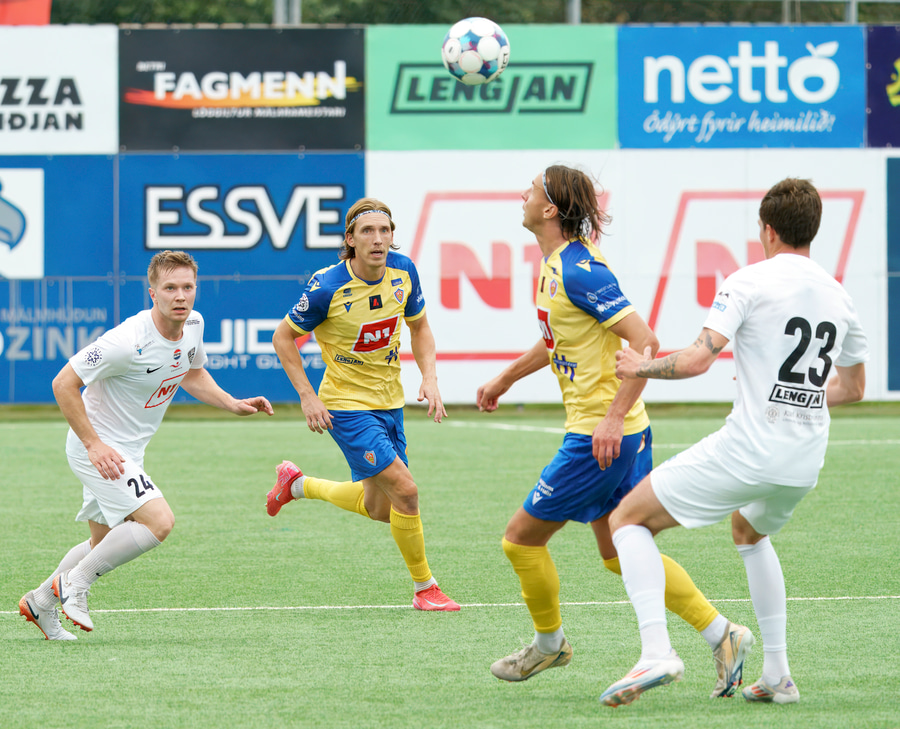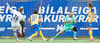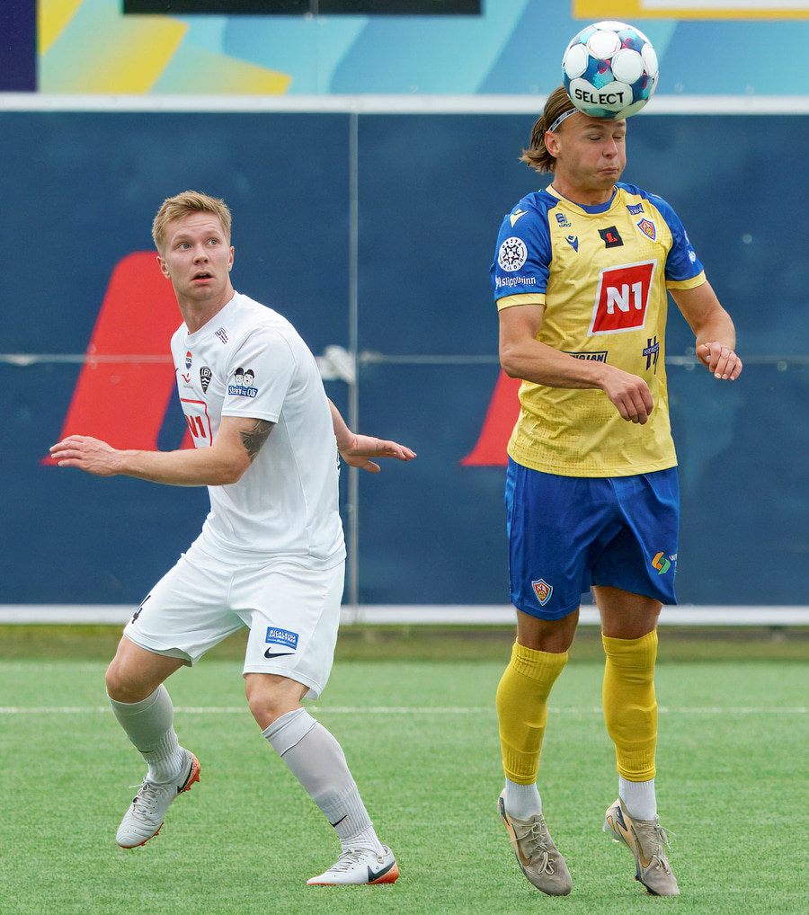 Hermann Þór og Jóan skella saman og liggja báðir eftir. Hermann Þór hreinsaði boltann í innkast og Jóan lendir eiginlega á honum - alltof seinn þarna, Færeyingurinn.