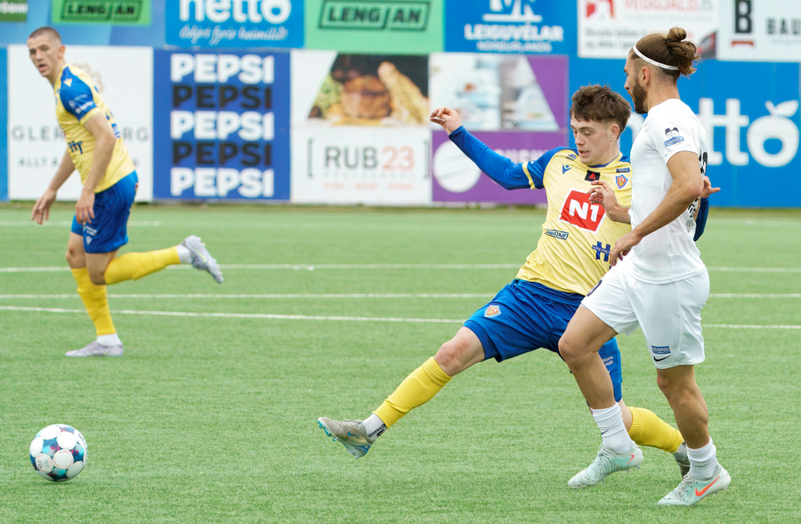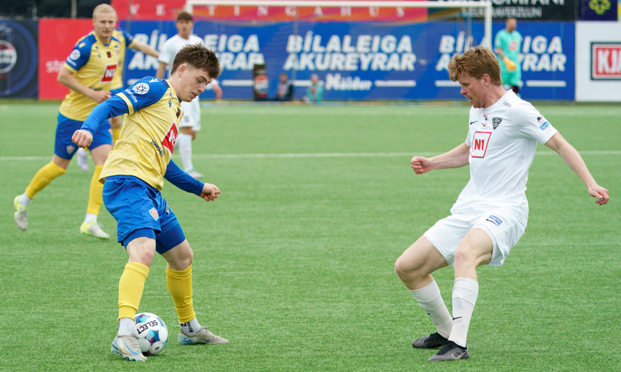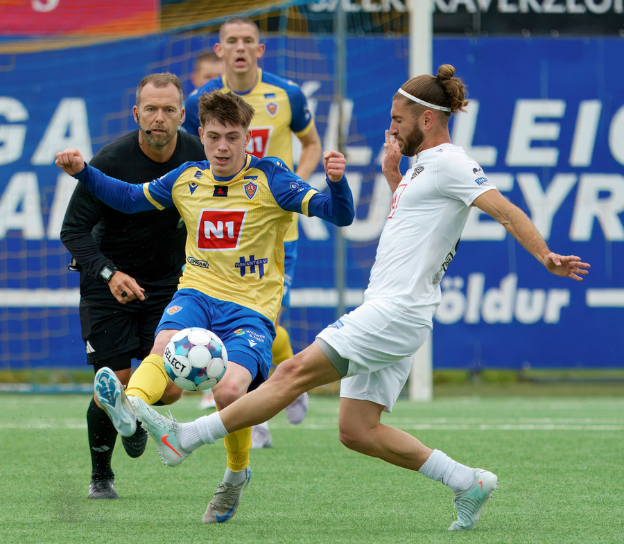 Guðjón Ernir Hrafnkelsson og Ingimar Torbjörnsson Stöle í baráttu um boltann í leik liðanna árið 2023. Þeir eru í dag samherjar hjá KA.