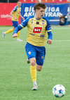Á gott þríhyrningsspil við Jóan við D-bogann og reynir að lauma boltanum í nærhornið, en Hjörvar Daði ver!