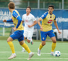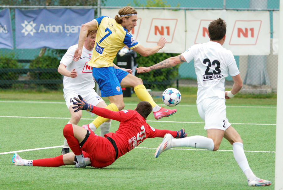 Birnir leggur boltann út í skot á Bjarna. Hann nær þéttingsföstu skoti, en það er of nálægt Hjörvari og hann slær boltann aftur fyrir í horn.