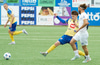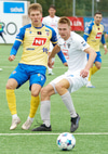 Ásgeir Sigurgeirsson er nálægt því að vera á undan Hjörvari Daða í bolta á miðjum vallarhelmingi ÍBV, en Hjörvar neglir boltanum í Ásgeir og útaf.