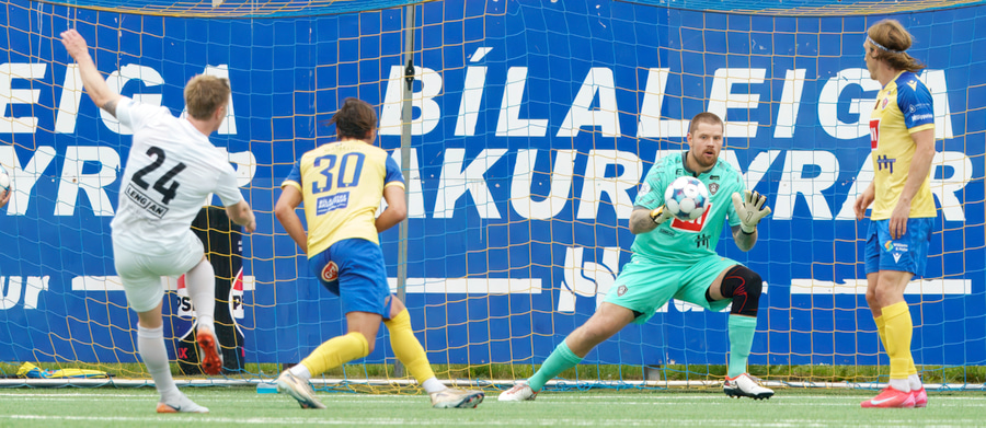 Ásgeir Sigurgeirsson gerir vel í pressunni og býr til eiginlega einn á einn stöðu fyrir Hallgrím, en Hjörvar kemur vel út á móti og ver frá Hallgrími. Fjörug byrjun KA manna!