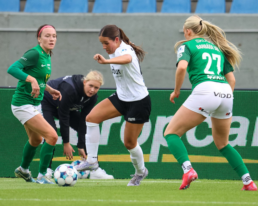 Maya Hansen fær boltann við vítateigslínuna og tekur skotið hátt yfir markið í staðinn fyrir að rúlla boltanum út á besta leikmann vallarins, Thelmu Karen.