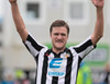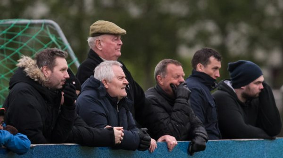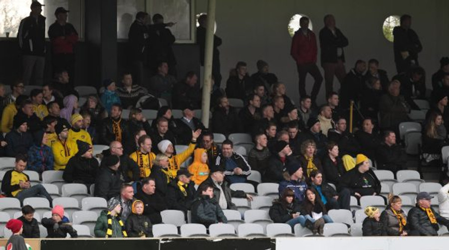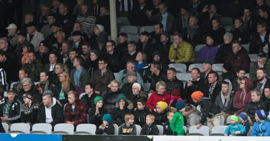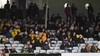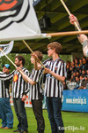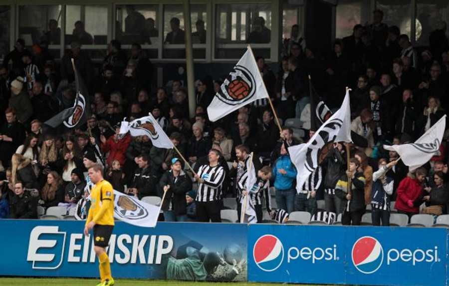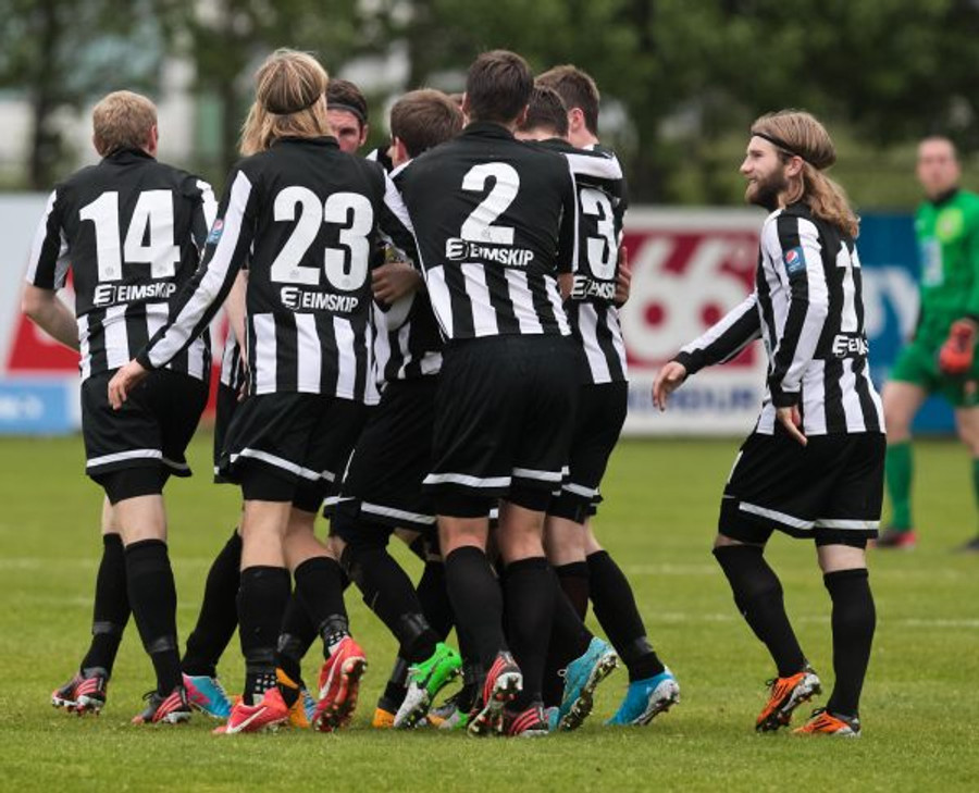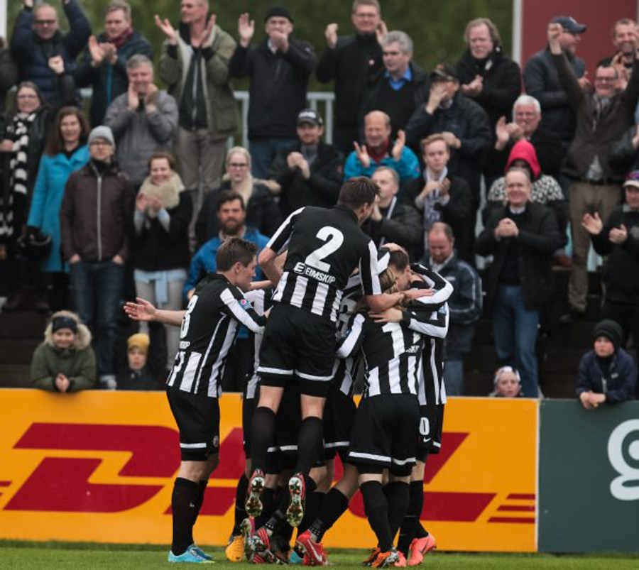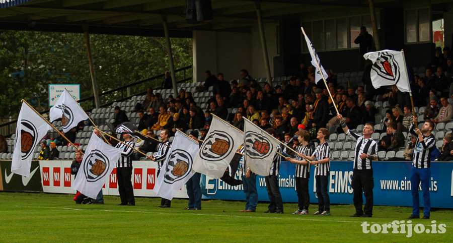 Hálfleikur! - Skagamenn í stúkunni fagna gríðarlega er Gunnar Jarl flautar til hálfleiks.