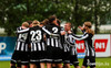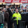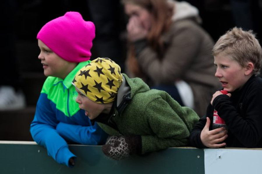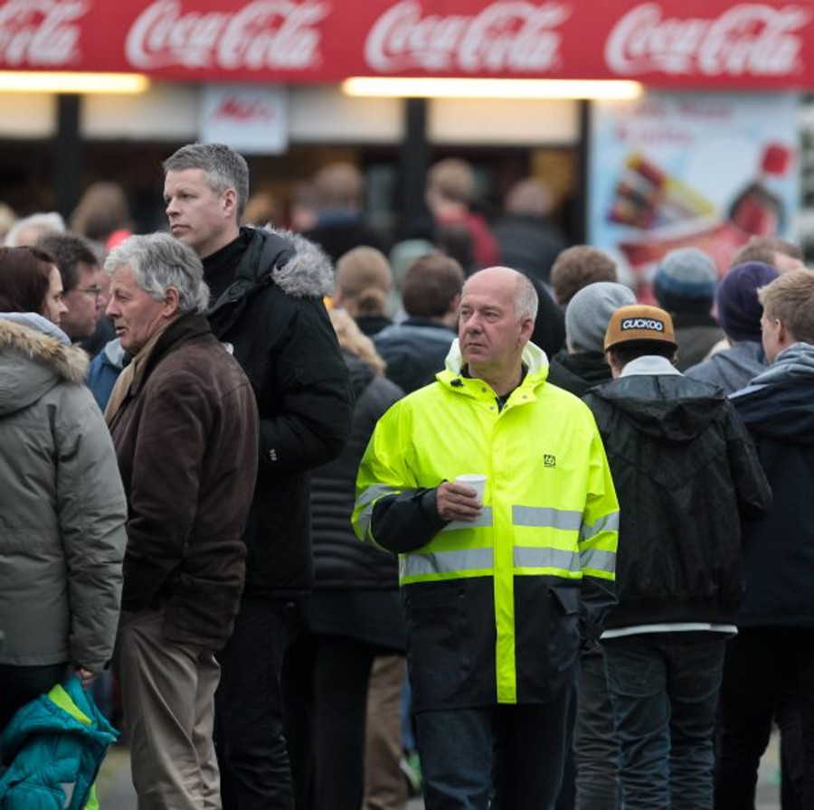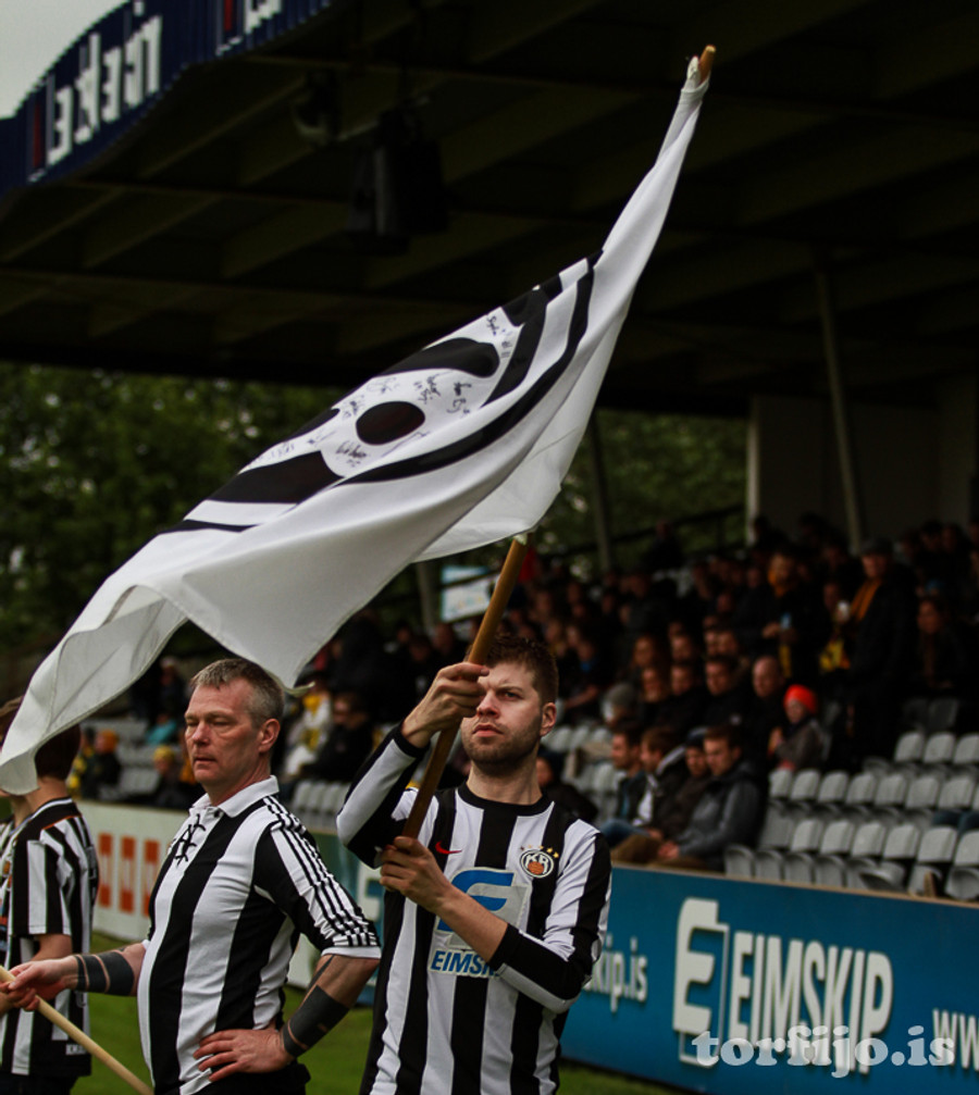 U.þ.b. 10 stuðningsmenn KR standa fyrir framan stúkuna með risastóra KR fána sem þeir ætla sér að flagga er liðin ganga inn á völlinn. Ágúst Borgþór Sverrisson, formaður stuðningsmannafélags KR fer þar fremstur í flokki.