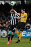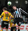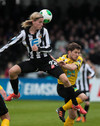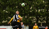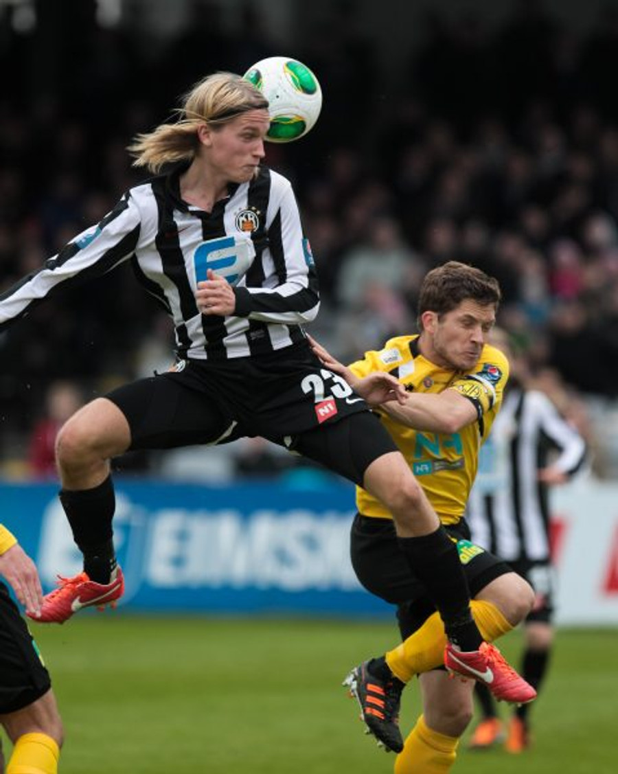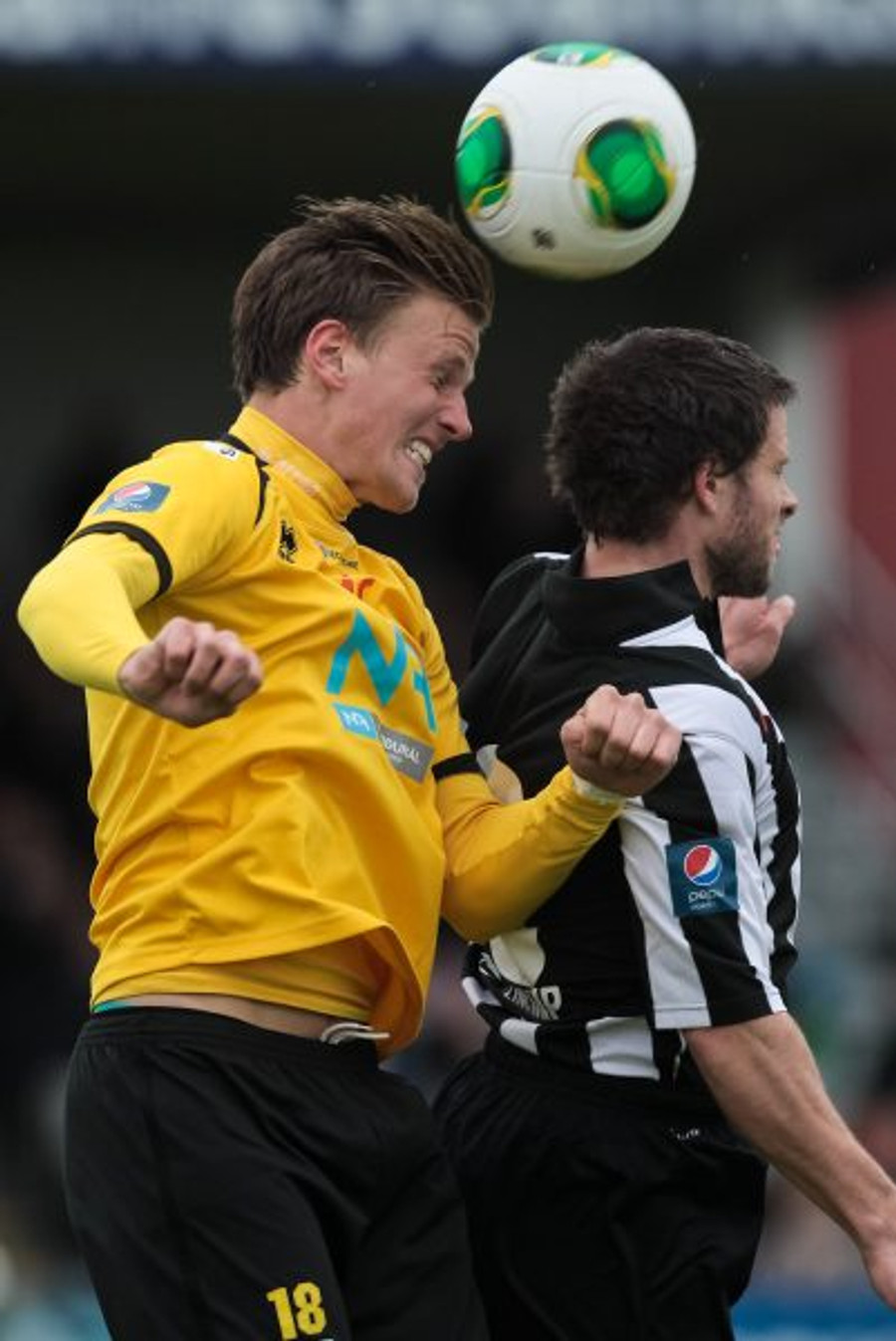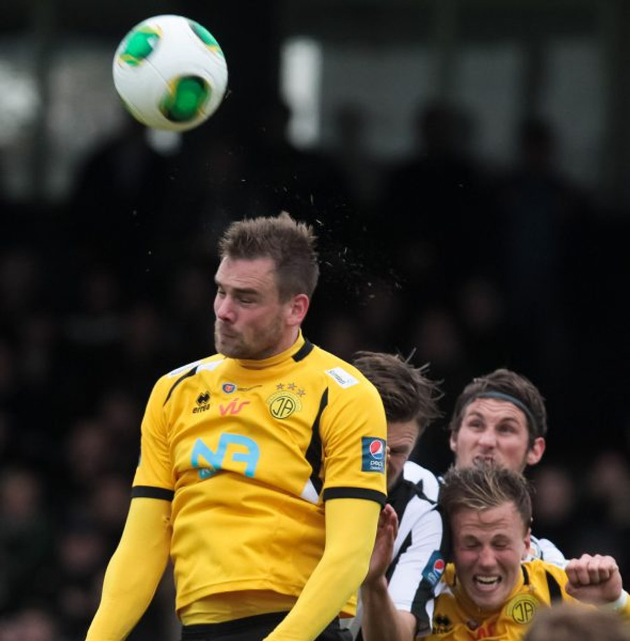 Arnar Már Guðjónsson á hörkuskalla að marki á fjærstönginni eftir hornspyrnu Jóhannesar Karls. Hannes gerir vel að grípa skallann.
