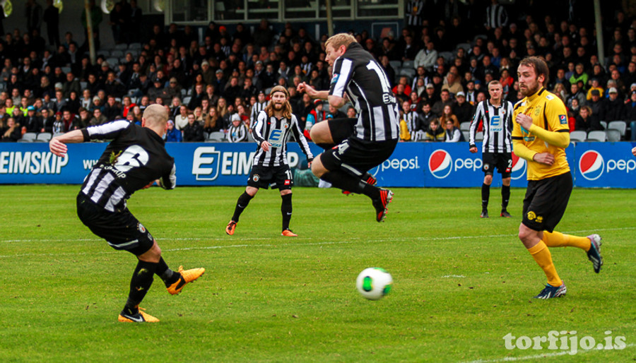 Þrumaði honum inn eftir klafs í teignum. Talað er um að skipta aldrei í horni en Eggert hafði komið inn fyrir Garðar þarna 10 sekúndum á undan.