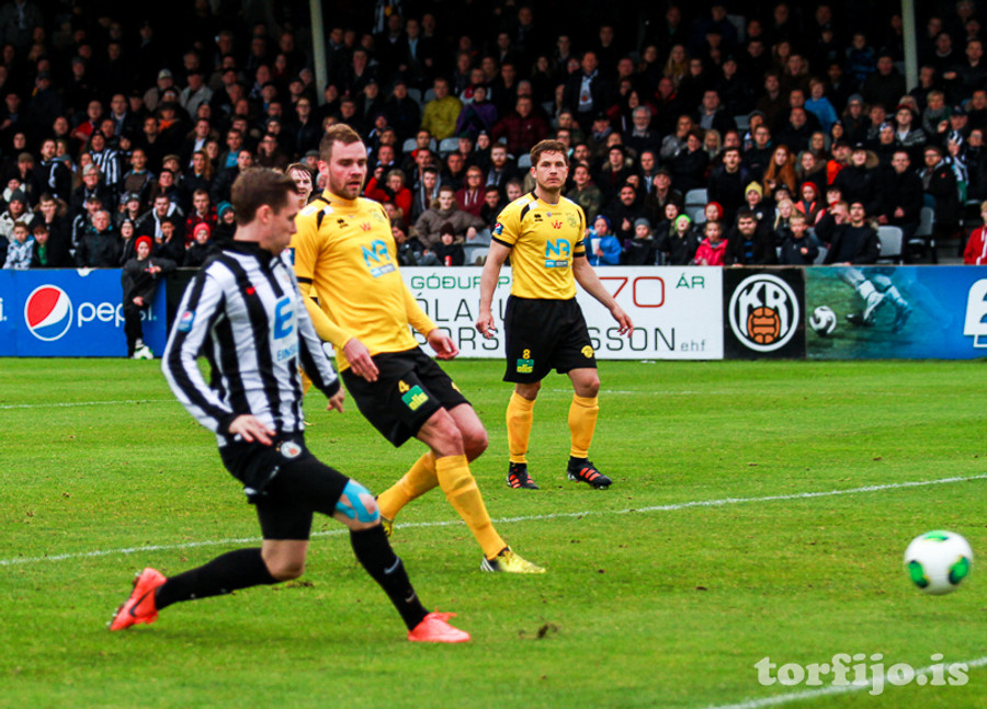 Bjarni Guðjónsson á utanfótarskot með vinstri en það fer beint á Árna Snæ. Sóknin var þó ágæt hjá KR-ingum og lofar góðu.