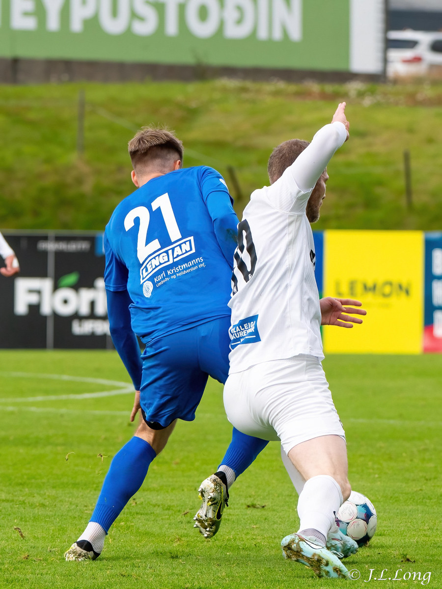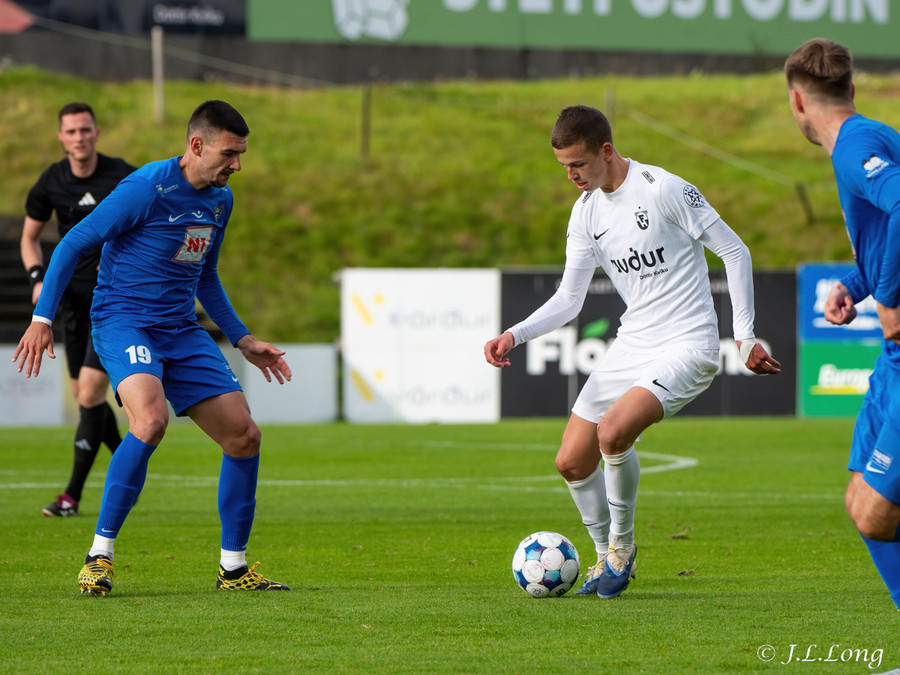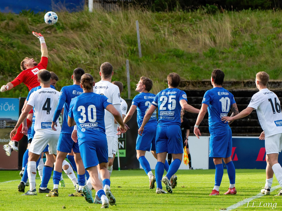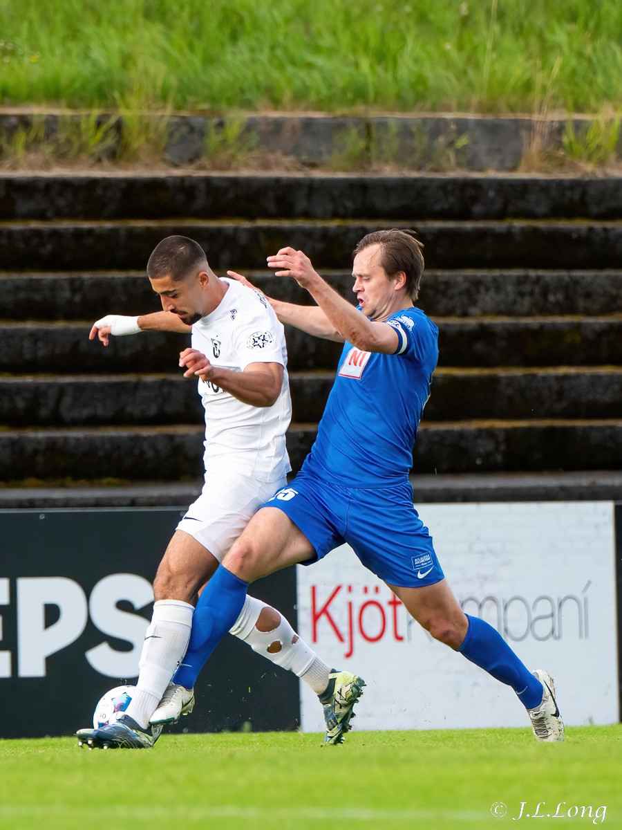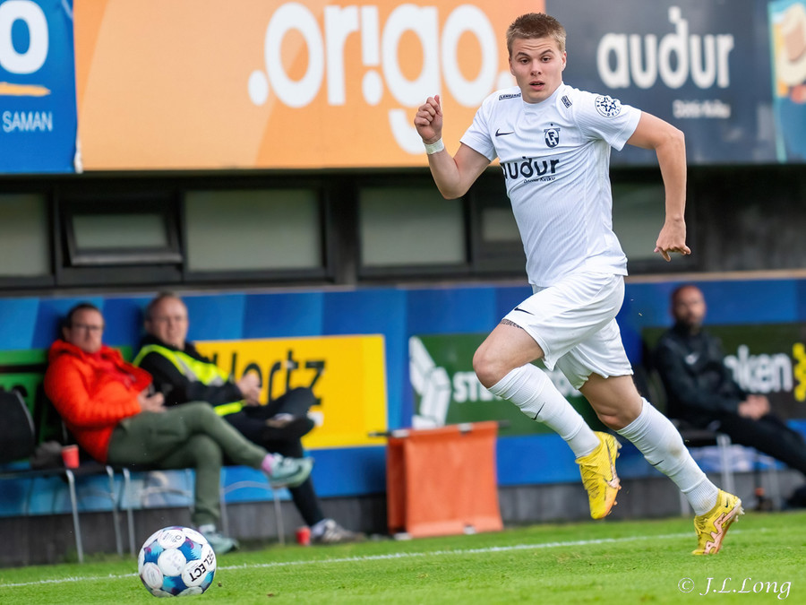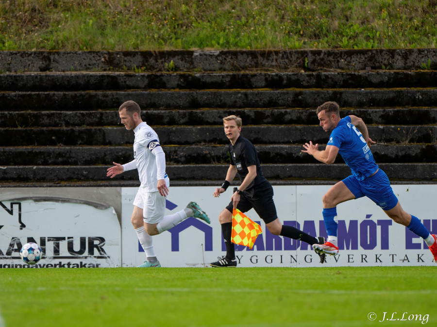 Fyrsta færið kemur strax eftir 20 sekúndur. Boltinn dettur fyrir Dag Örn sem er í fínu færi, en skotið hans framhjá.