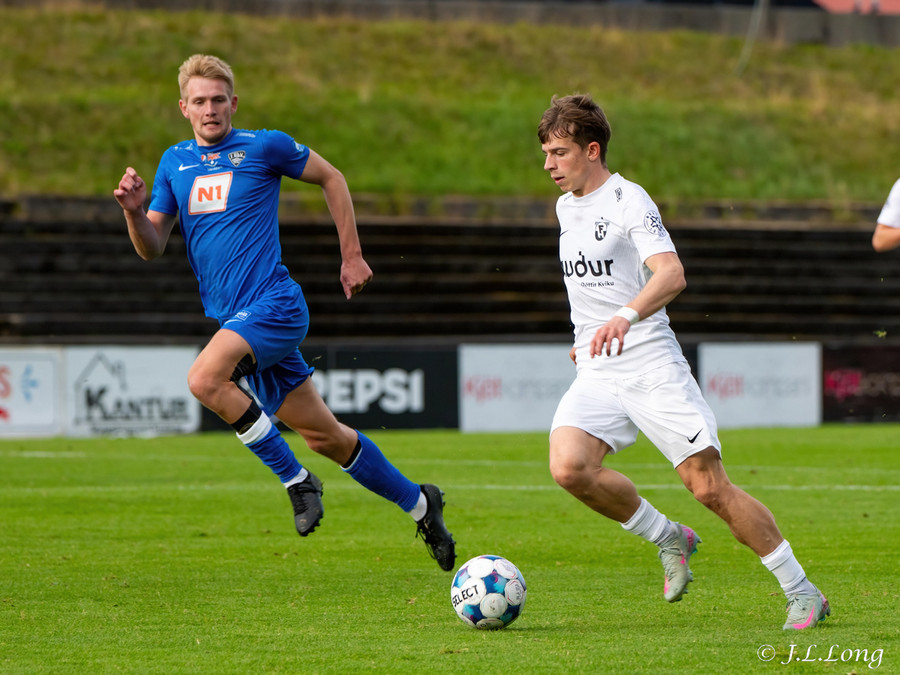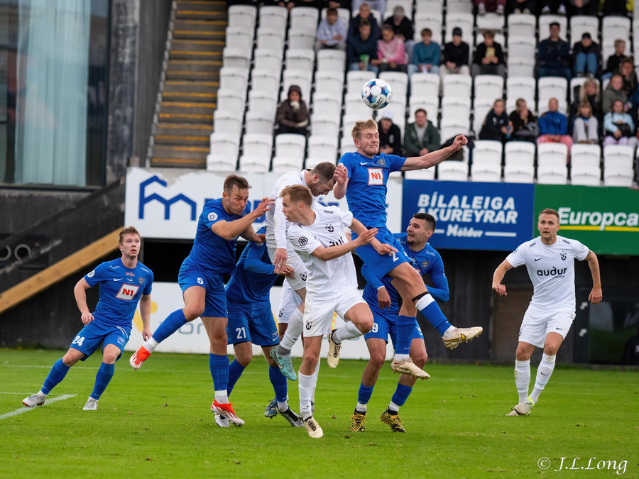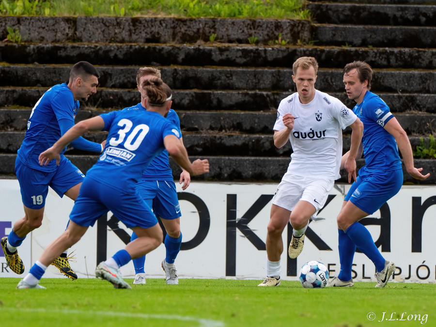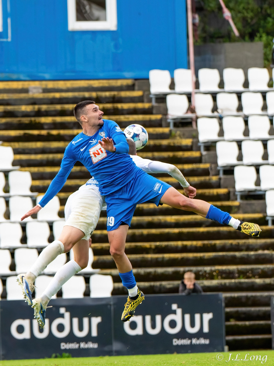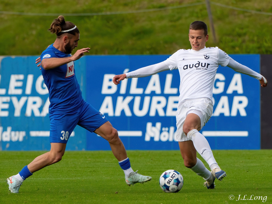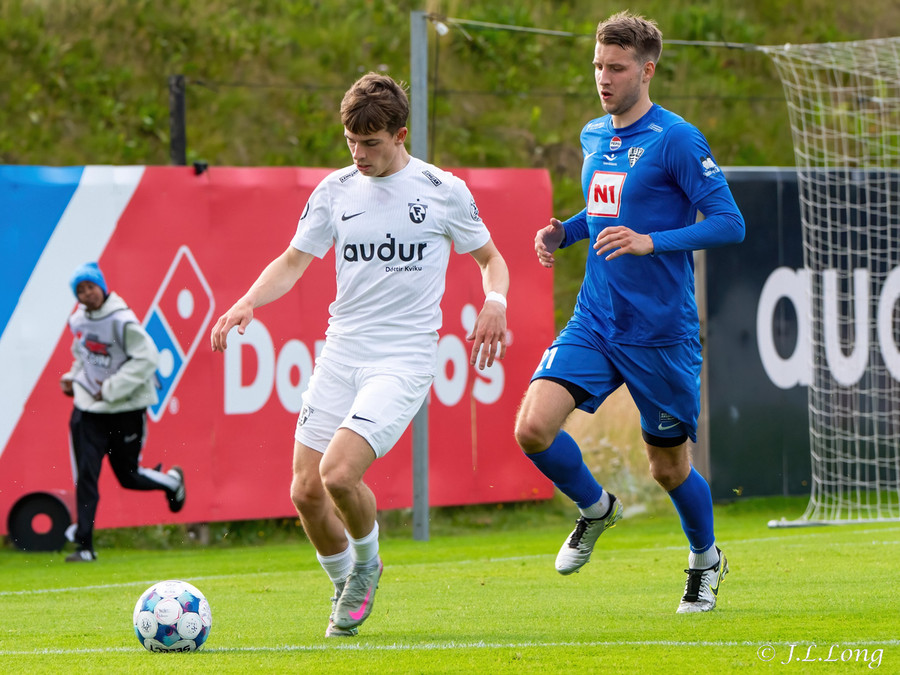 Fyrsta færið kemur strax eftir 20 sekúndur. Boltinn dettur fyrir Dag Örn sem er í fínu færi, en skotið hans framhjá.