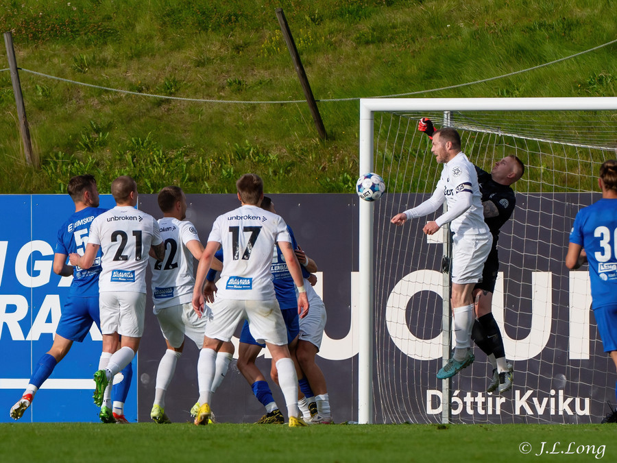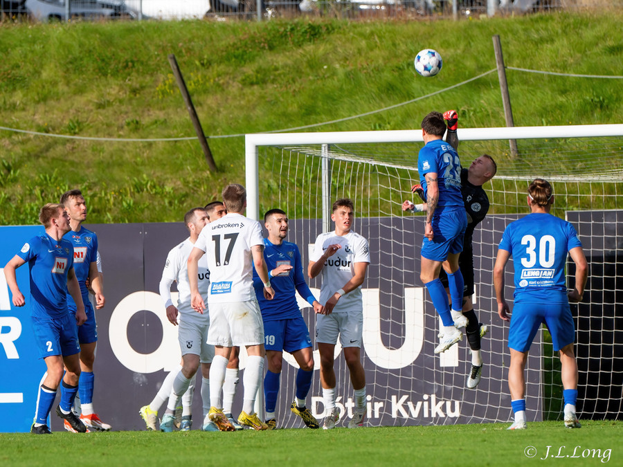 Björn Daníel þykist ætla að taka spyrnuna og þá fer veggurinn á hreyfingu. Kjartan þrumar svo boltanum í fjærhornið!
