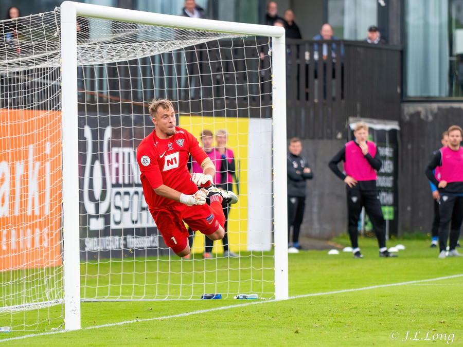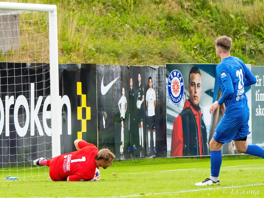 Flott spil hjá heimamönnum upp vinstri kantinn. Böðvar og Kjartan leika á milli sín áður en að Böðvar stingur boltanum inn fyrir á Björn Daníel. Hann kemur með fast skot af stuttu færi en beint á Marcel.