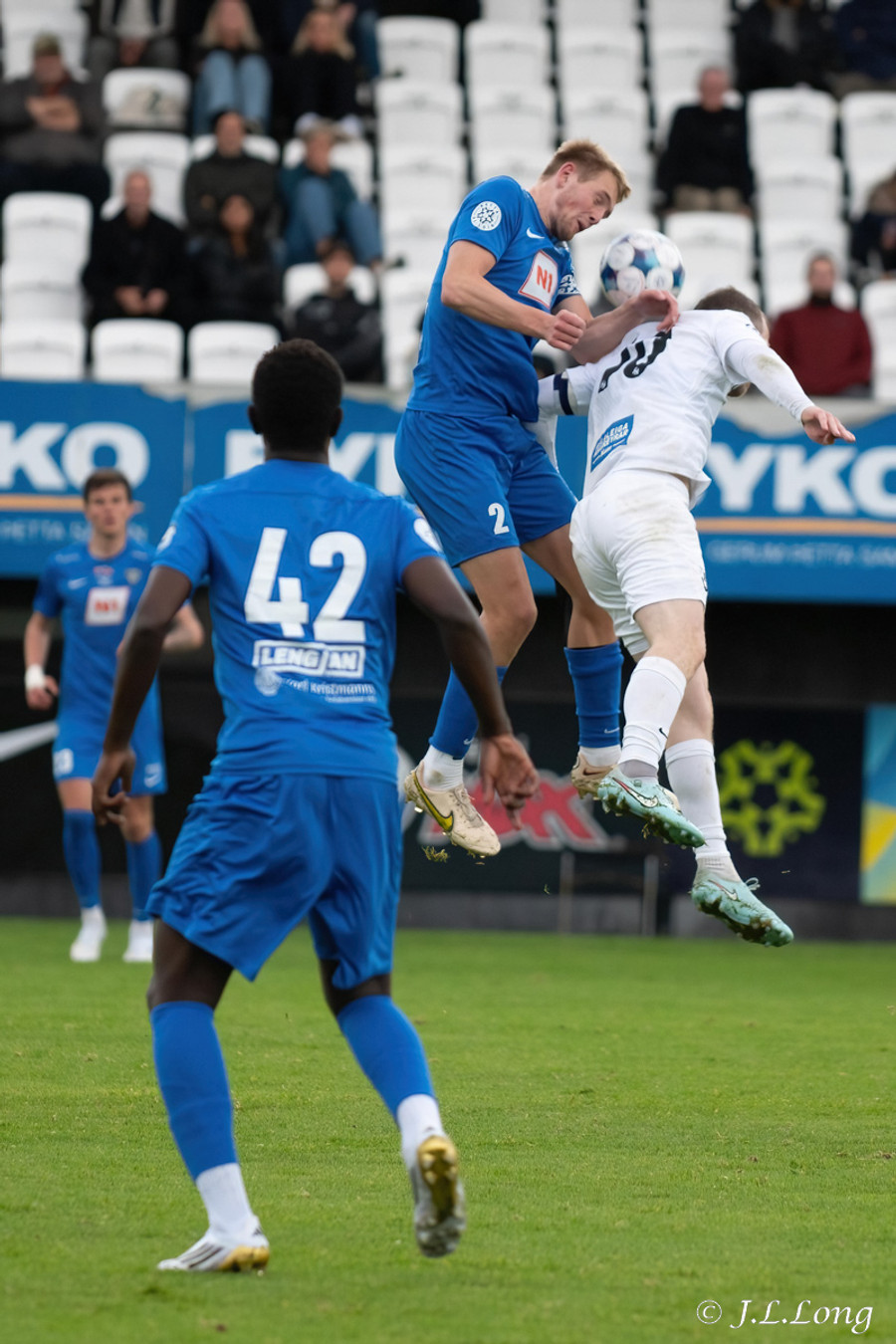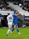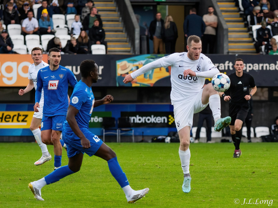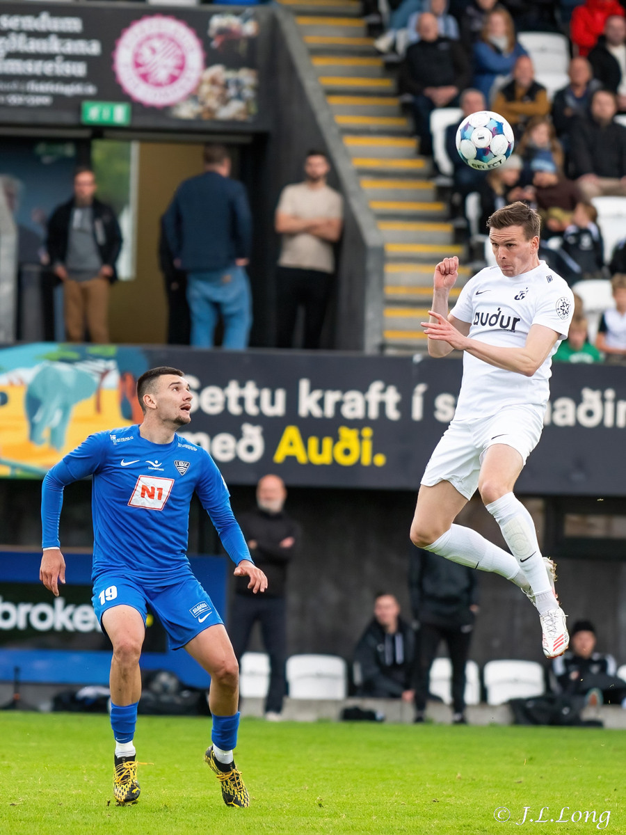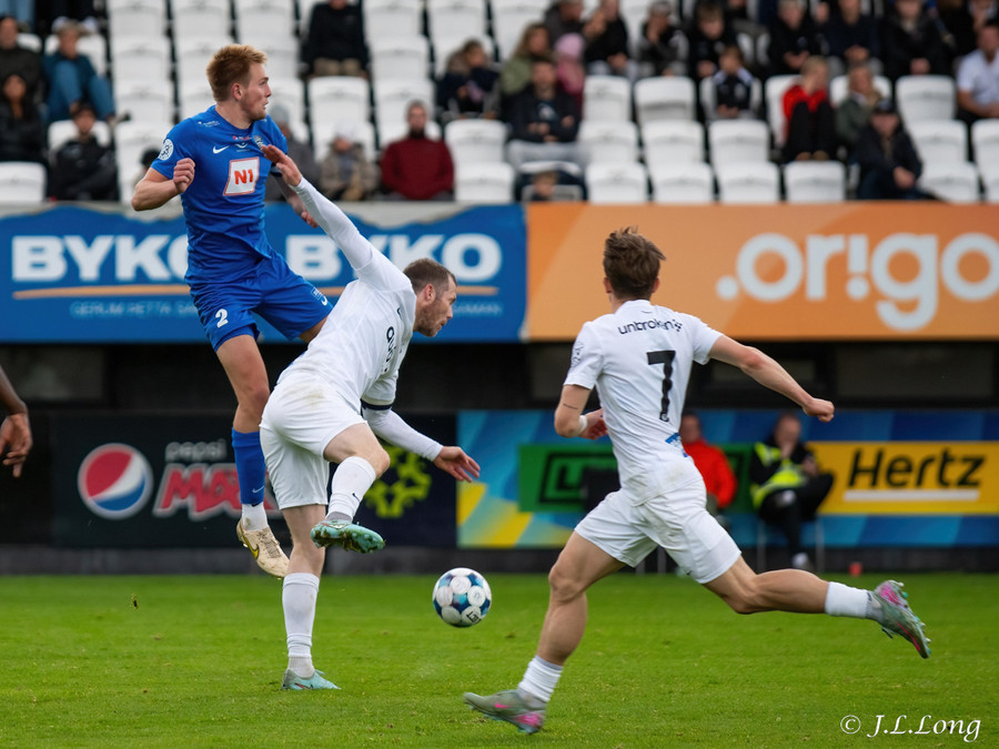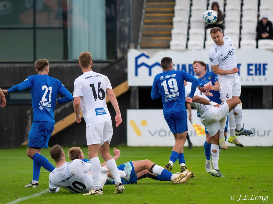 Kjartan Kári með aukaspyrnu beint á kollinn á Björn Daníel. Skallinn hans hins vegar beint á Marcel.